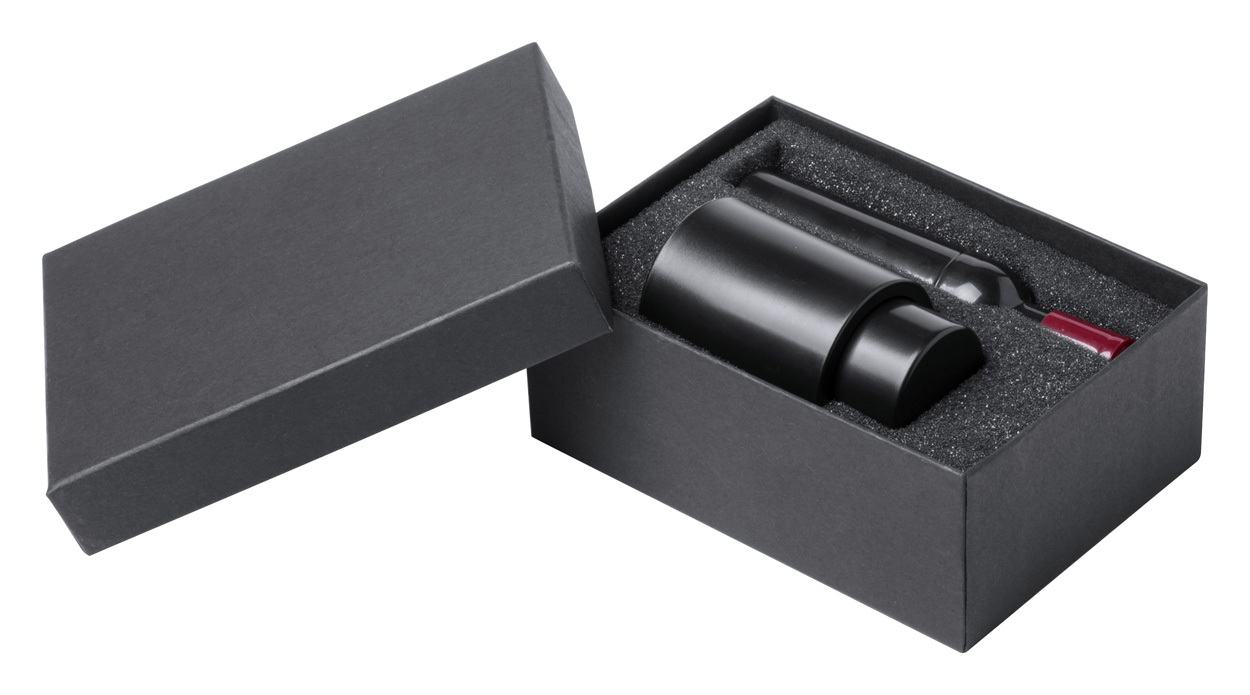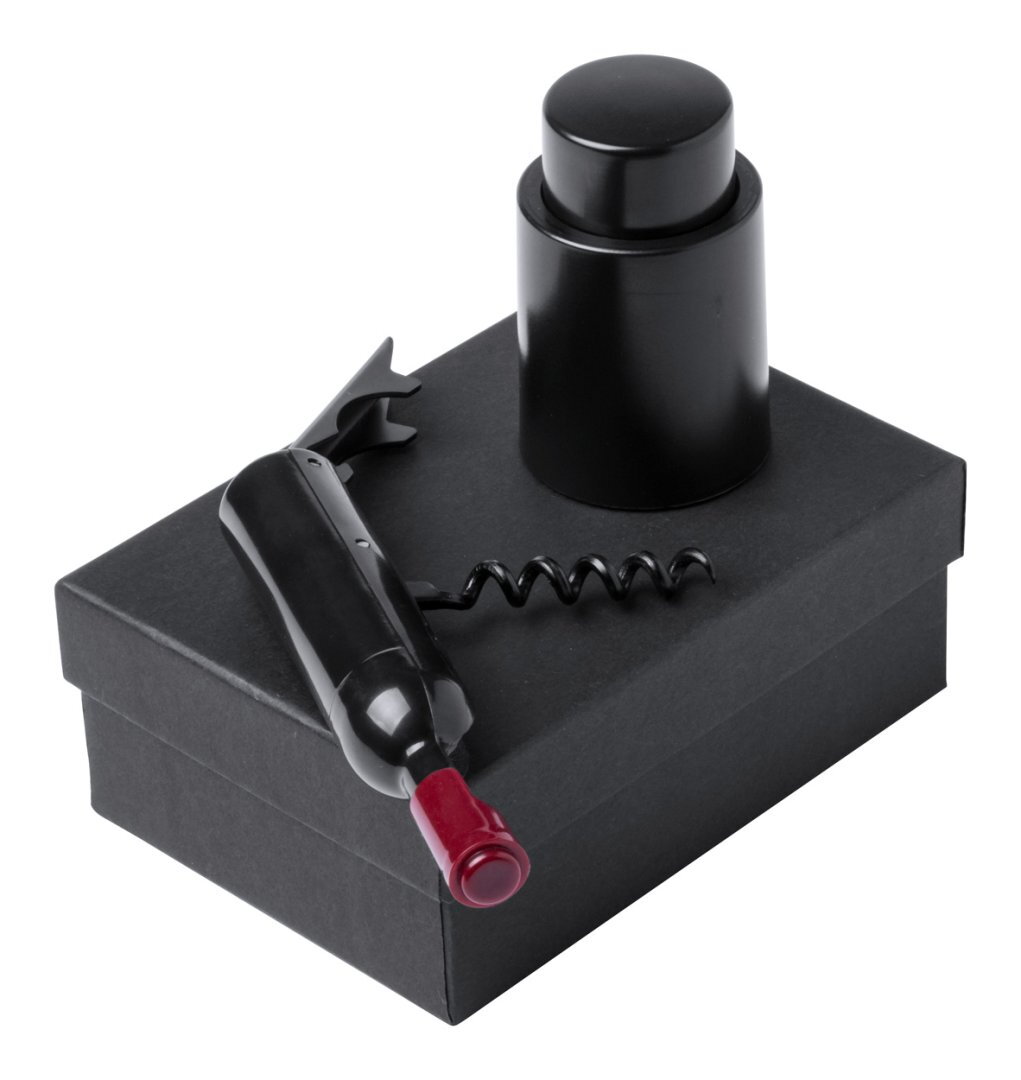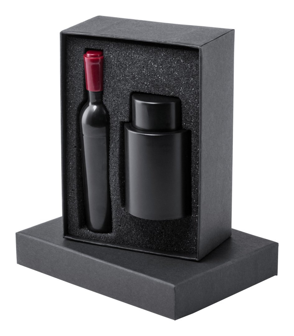 Boroskészlet üveg alakú dugóhúzóval, dugóval. Fekete ajándékdobozban.