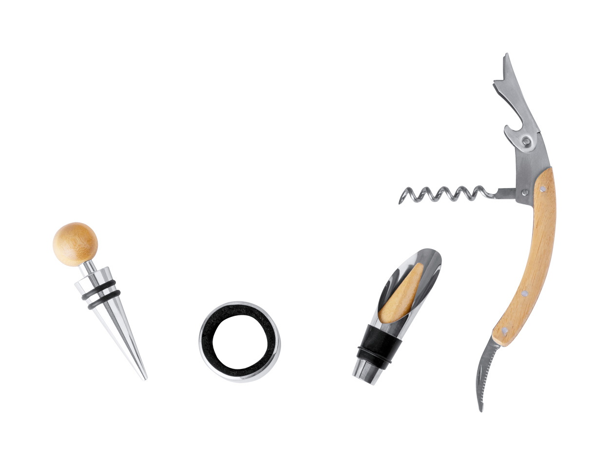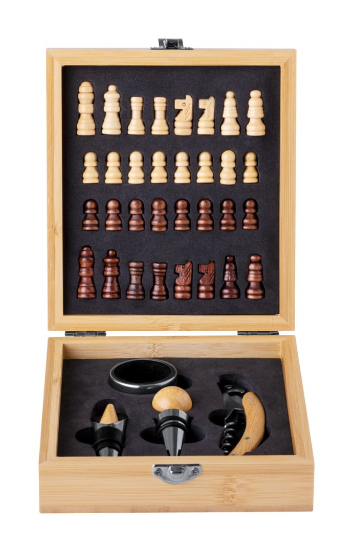4 db-os bambusz betétes, rozsdamentes boros szett bambusz dobozban, sakktáblával és 32 sakkfigurával. Tartalmaz egy dugóhúzót, cseppőrt, fúvókát és dugót.