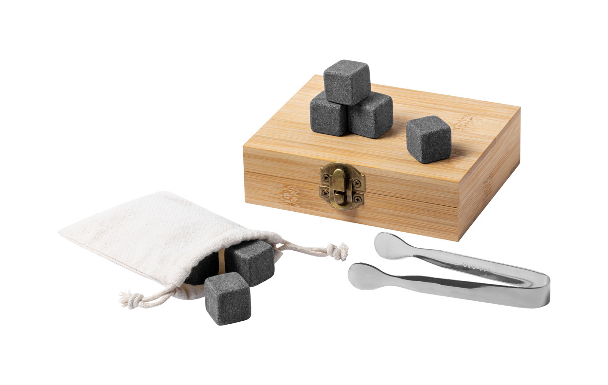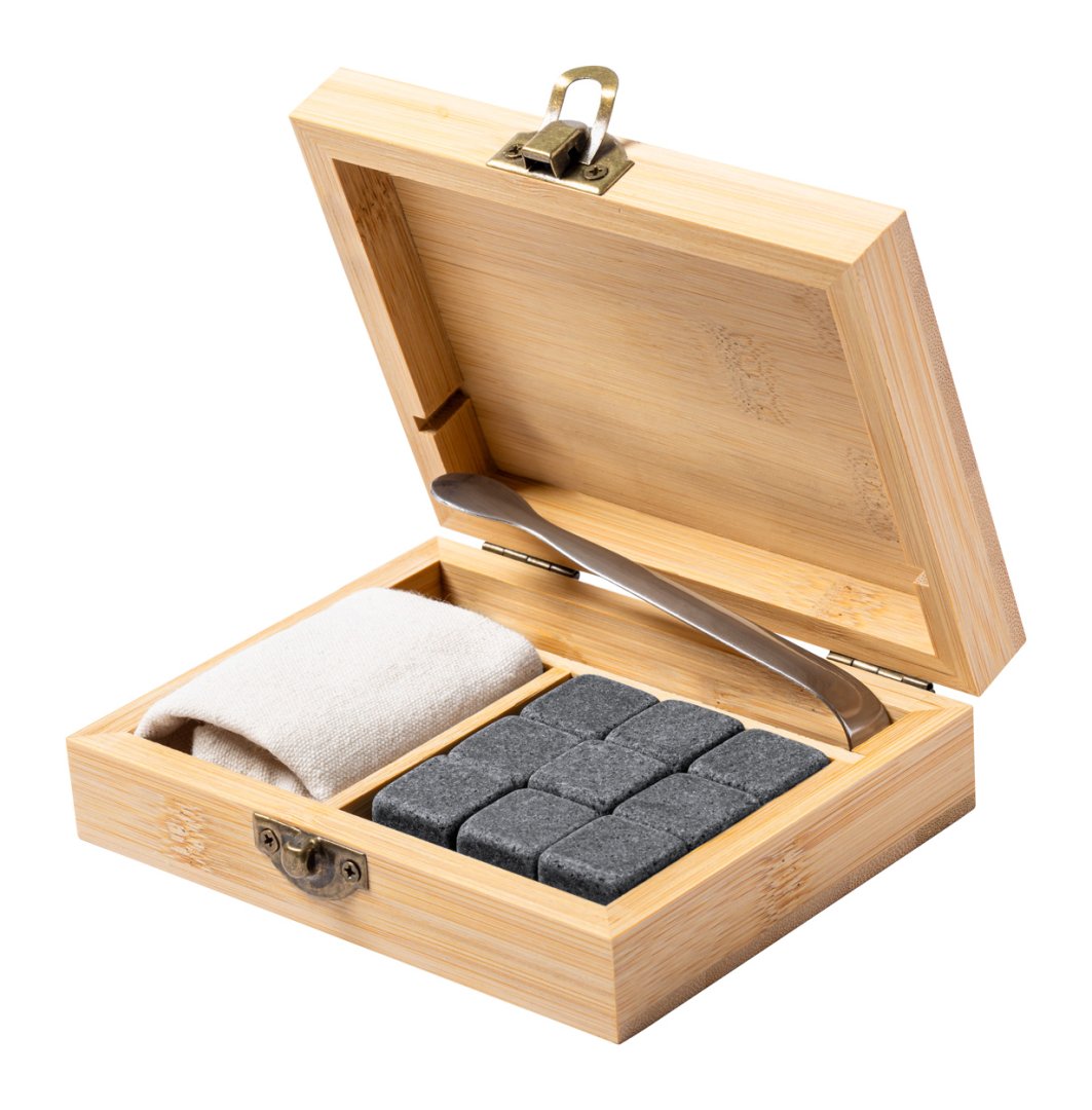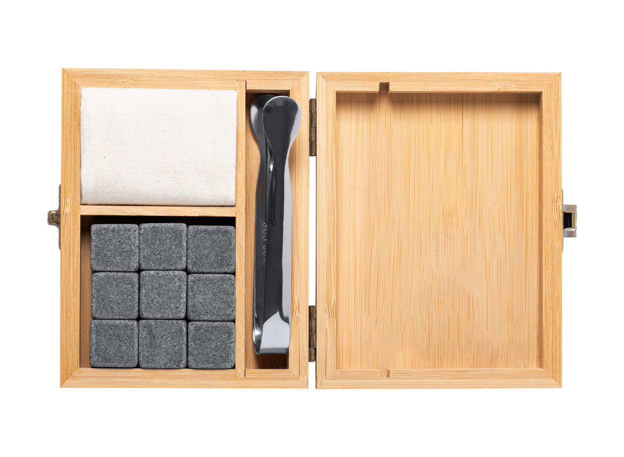 Újrahasználható, kő jégkocka szett bambusz dobozban. Tartalmaz: 9 jégkockát, egy pamut tasakot és rozsdamentes acél fogókat.