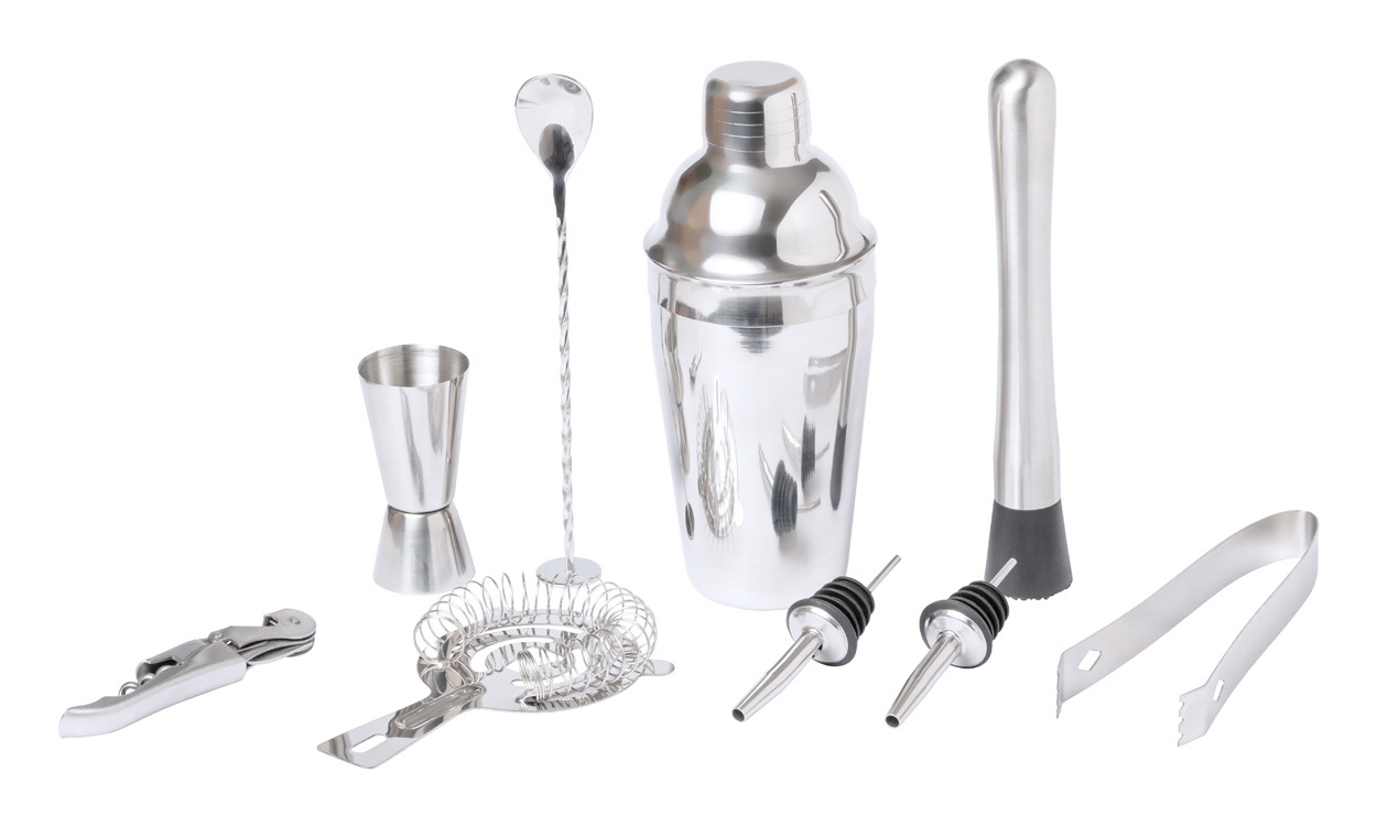 Elegáns, rozsdamentes acél koktélszett bambusz tartóban. Tartalma: 1 shaker (550 ml), mozsár, mérőpohár, jégfogó, szűrő, dugóhúzó, keverő kanál és 2 adagolókupak.