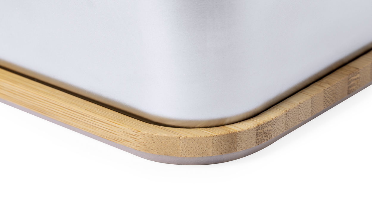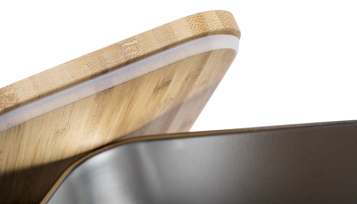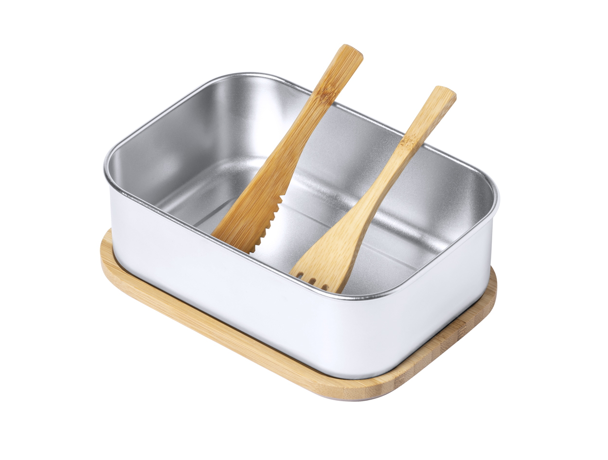 Rozsdamentes acél uzsonnás doboz, természetes bambusz tetővel. Evőeszköz szettel (villa és kanál) és gumipánttal.
