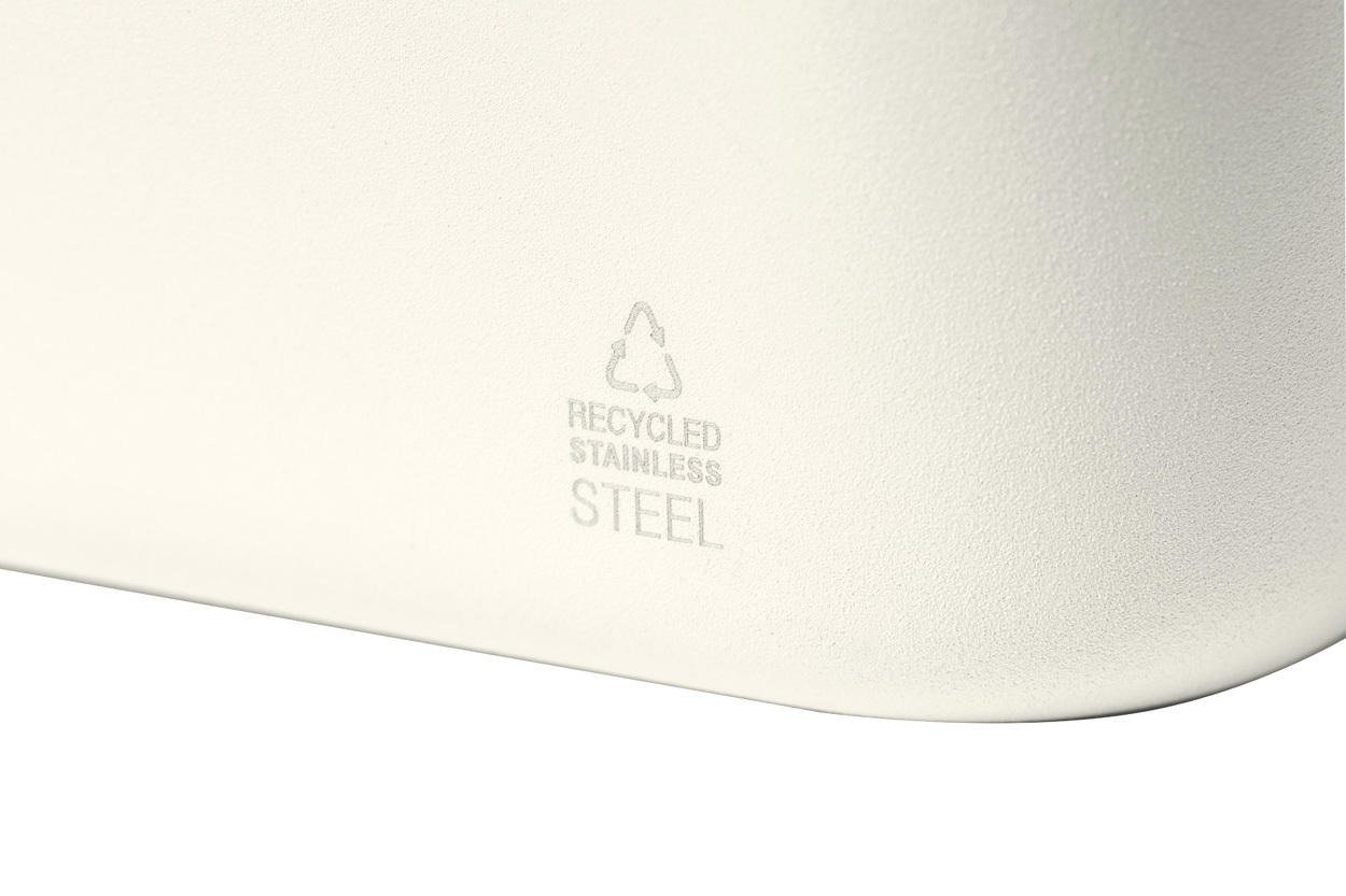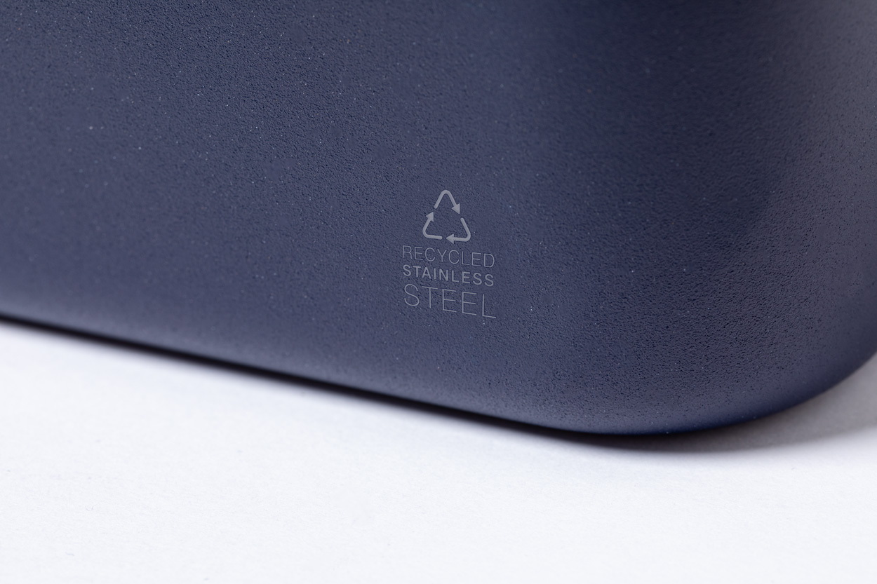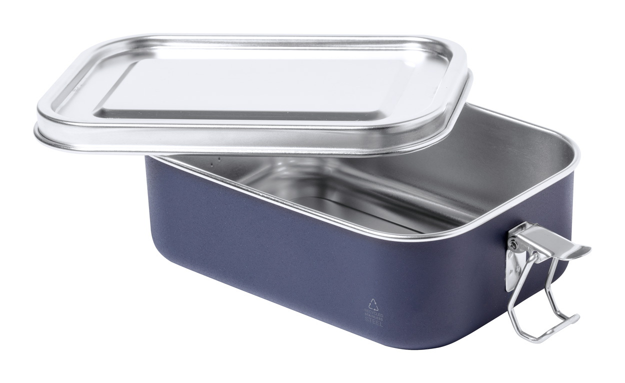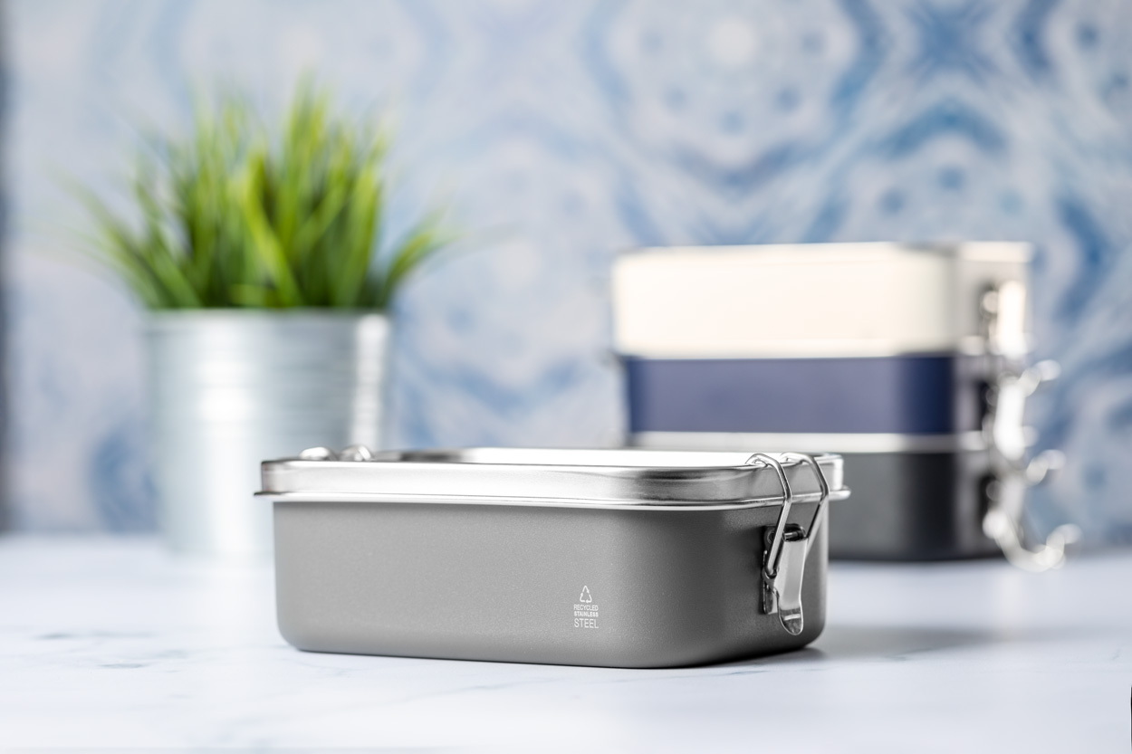 Újrahasznosított rozsdamentes acélból készült, színes uzsonnásdoboz, kontrasztos fedéllel és biztonsági csatos zárral, 750 ml.