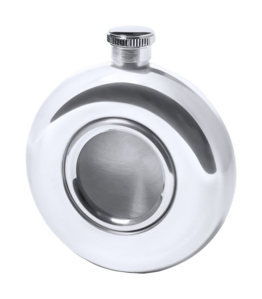 Kerek, rozsdamentes acél flaska átlátszó résszel az oldalán, 150 ml.