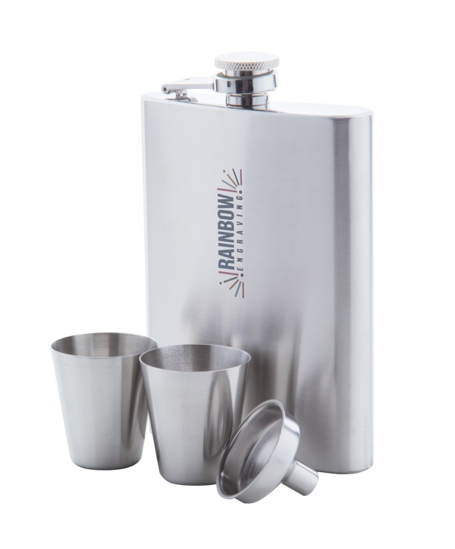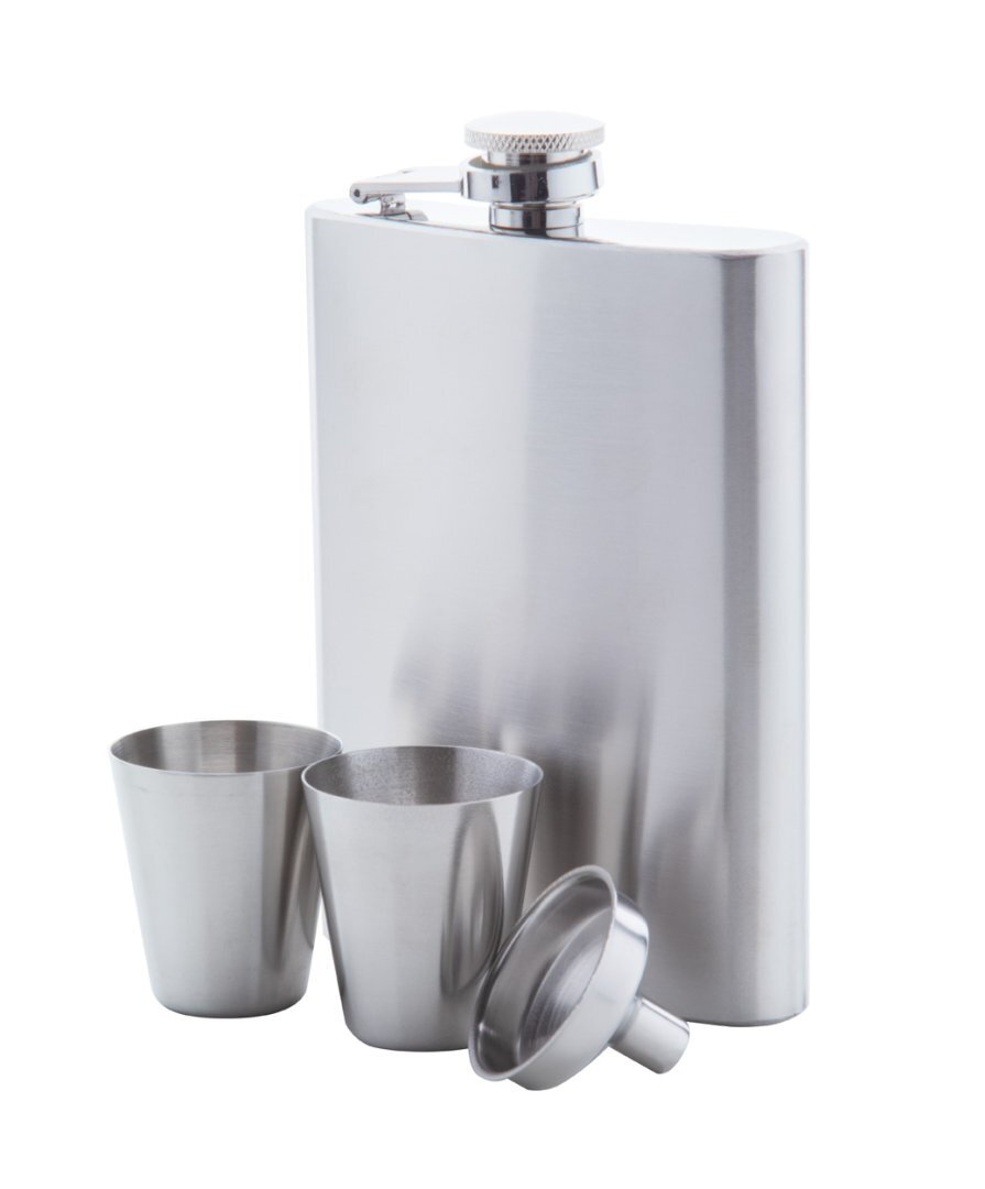 Rozsdamentes acél laposüveg szett tölcsérrel és 2 feles pohárral, 230 ml. Fekete díszdobozban szállítjuk.