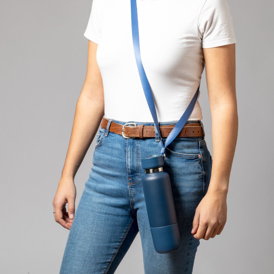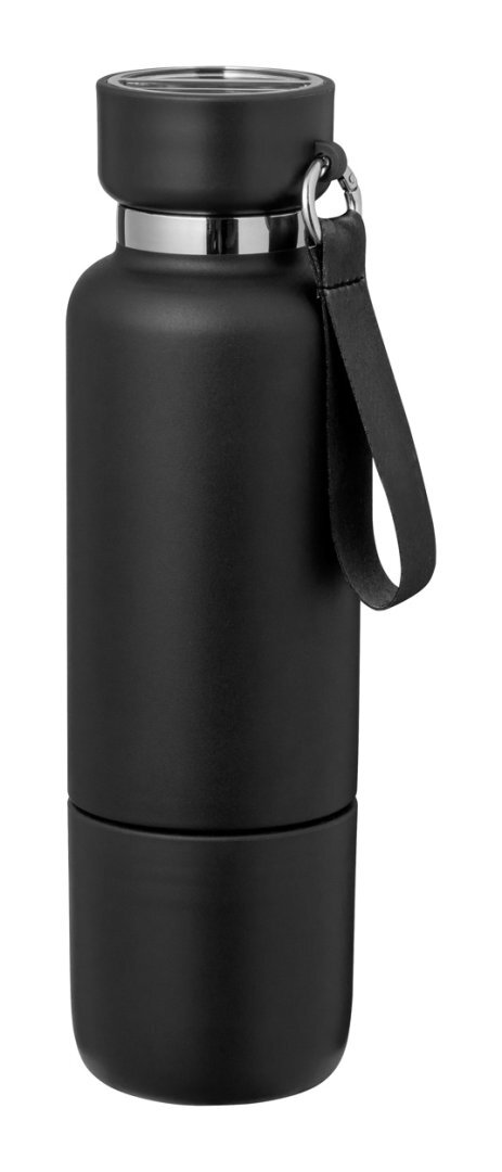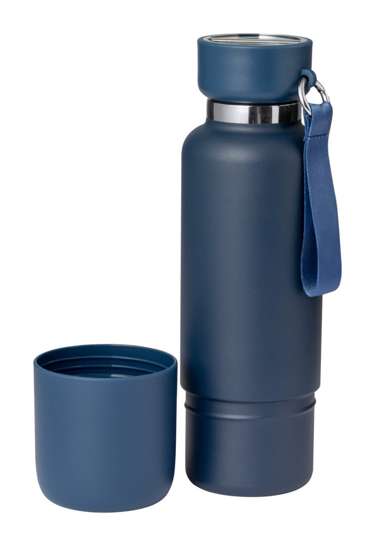 Rozsdamentes acél termosz hordszíjjal, 500 ml. Beépített PP műanyag pohárral, 300 ml.