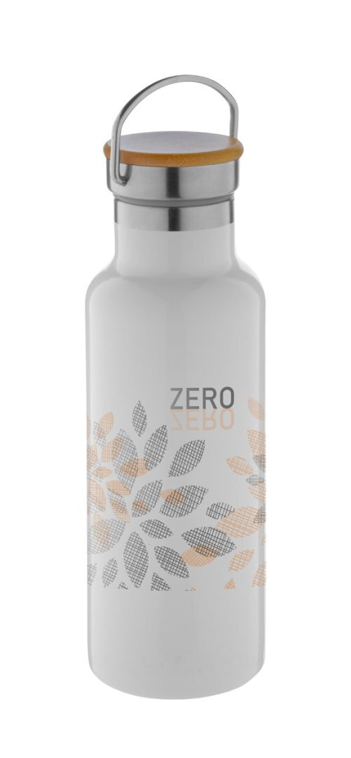 Duplafalú rozsdamentes acél, vákuumos termosz bambusz akasztós kupakkal, 500ml. Ideális szublimációs emlémázáshoz.