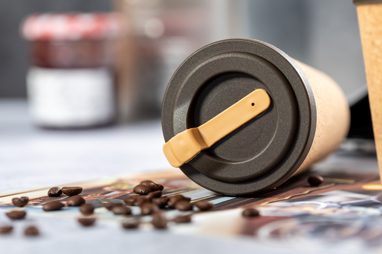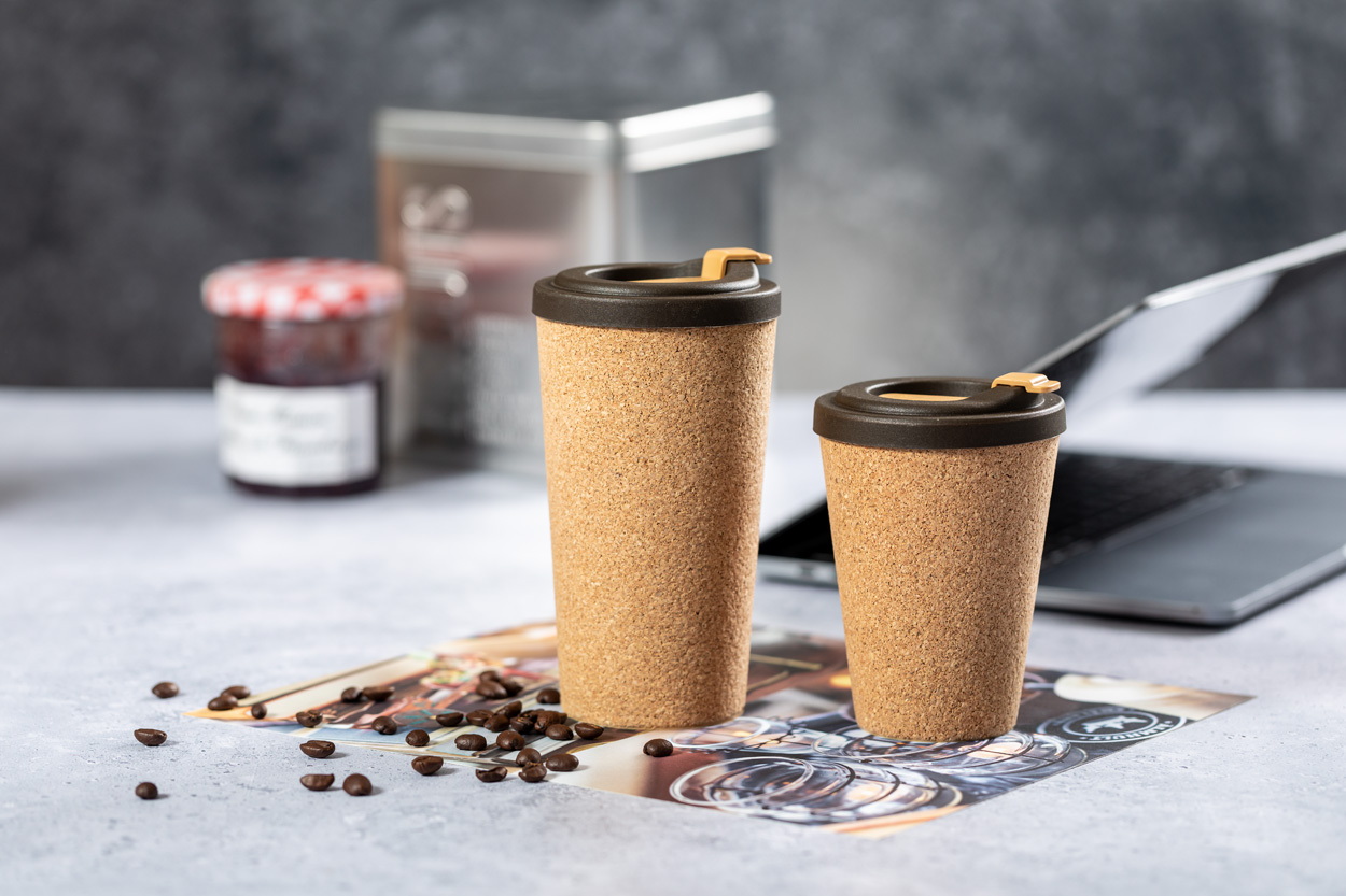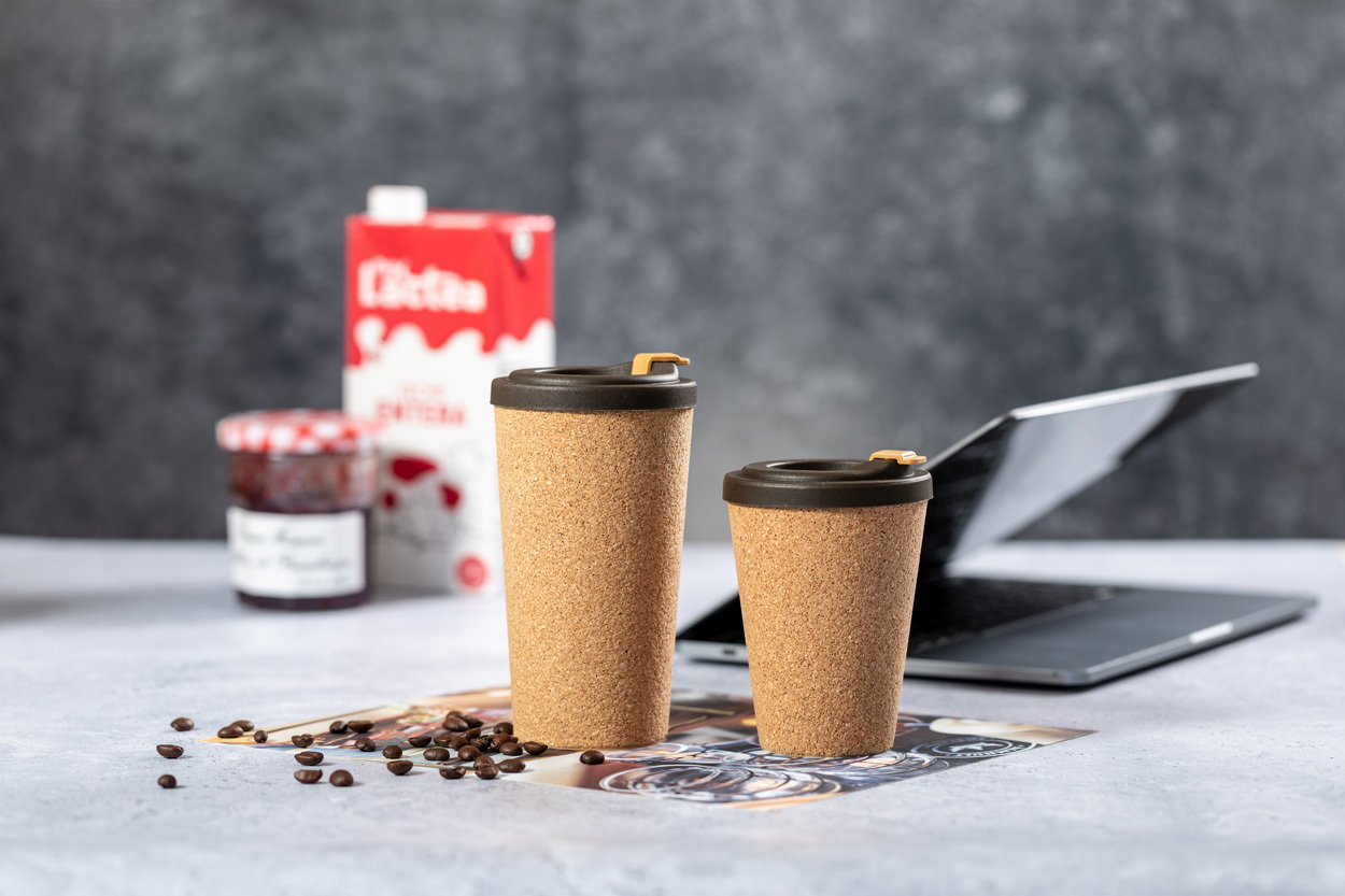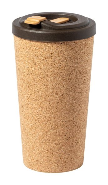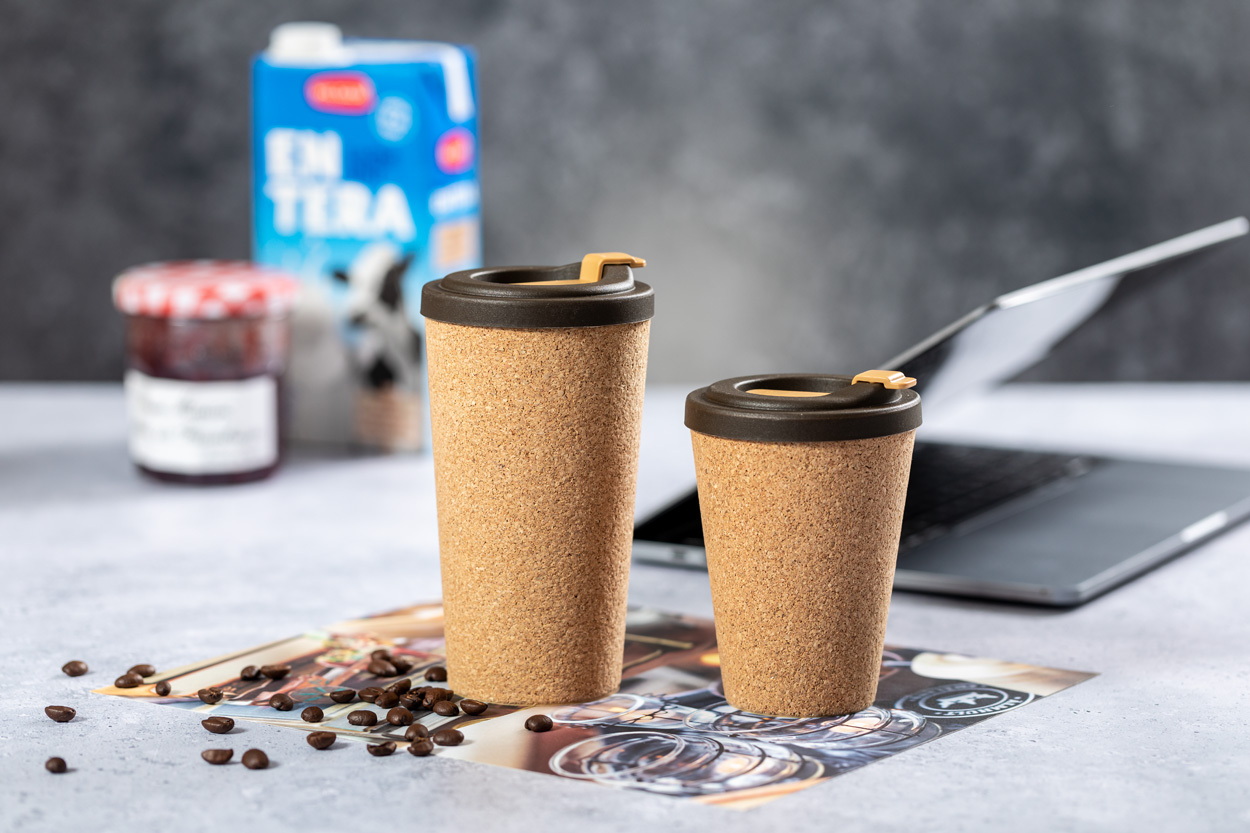 Természetes parafa bevonatú, duplafalú PP műanyag thermo bögre ivófedéllel. 500 ml, BPA mentes.
