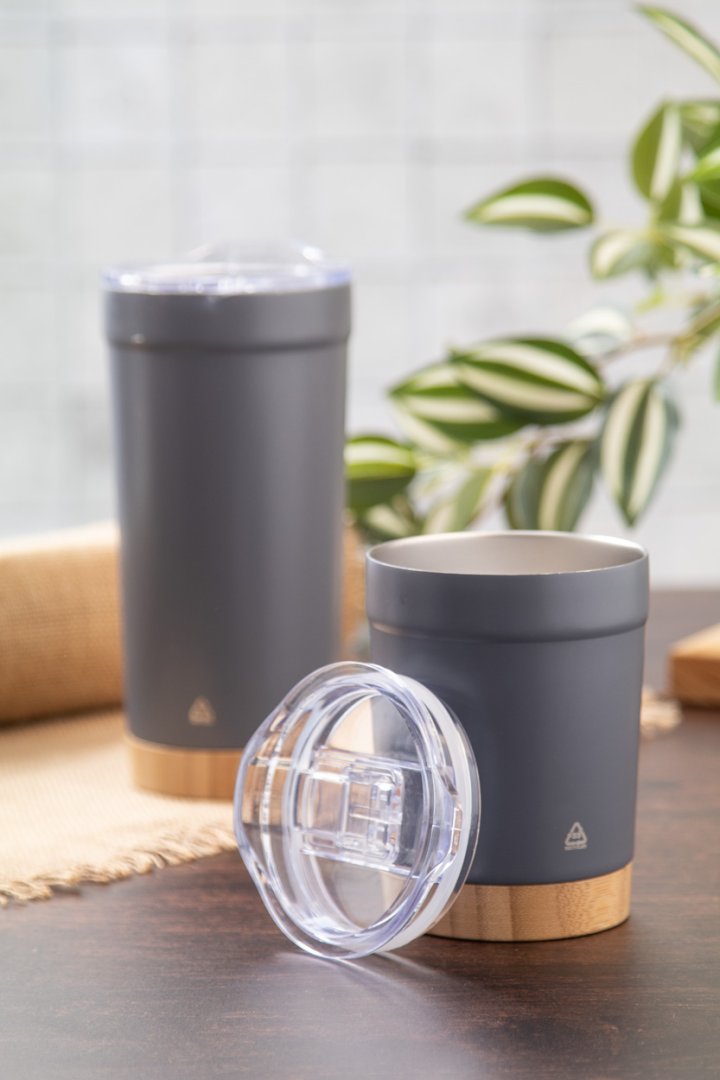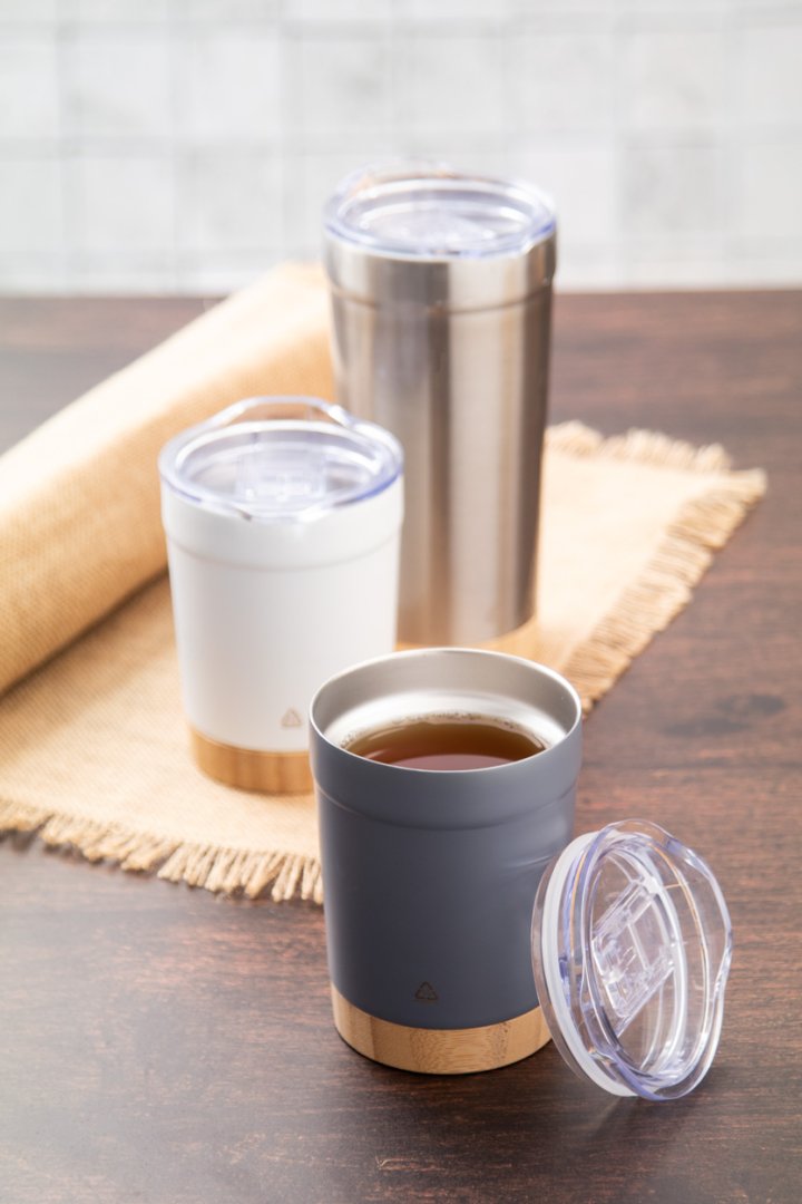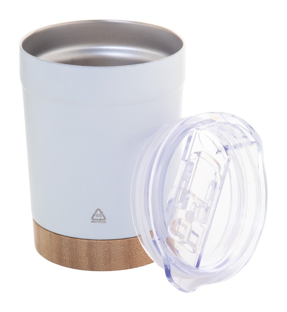 Duplafalú, újrahasznosított rozsdamentes acél vákuumszigetelt thermo pohár bambusz alappal és ABS műanyag ivófedéllel. 300 ml.