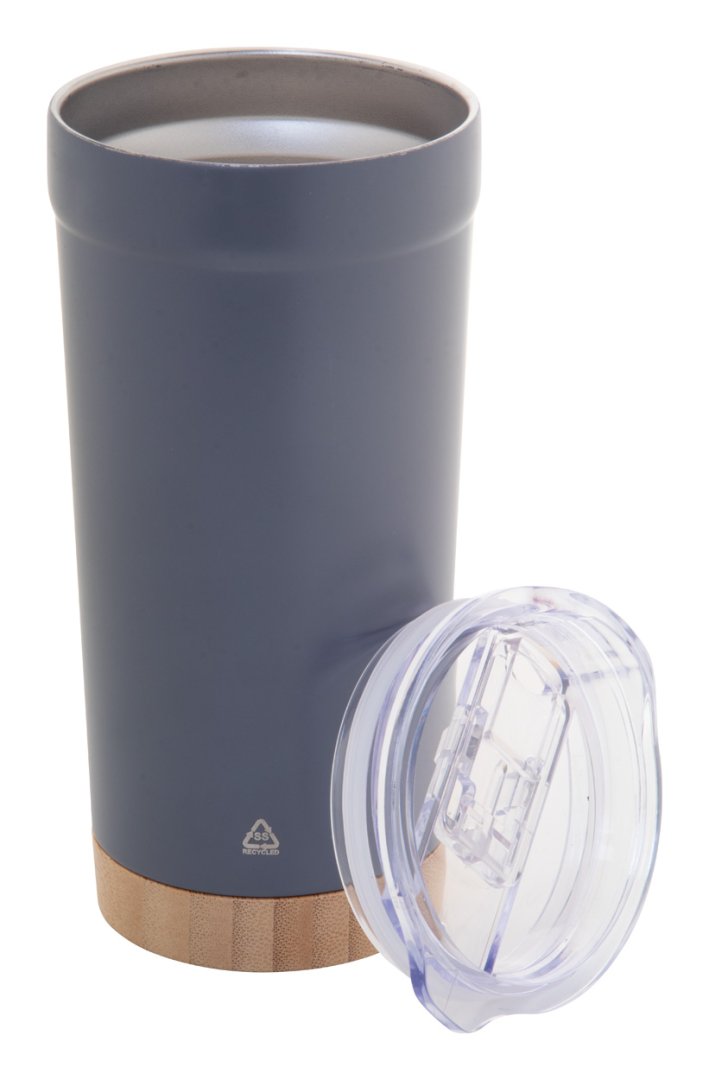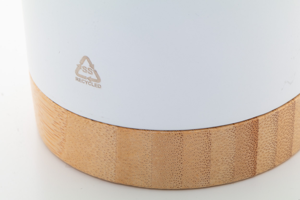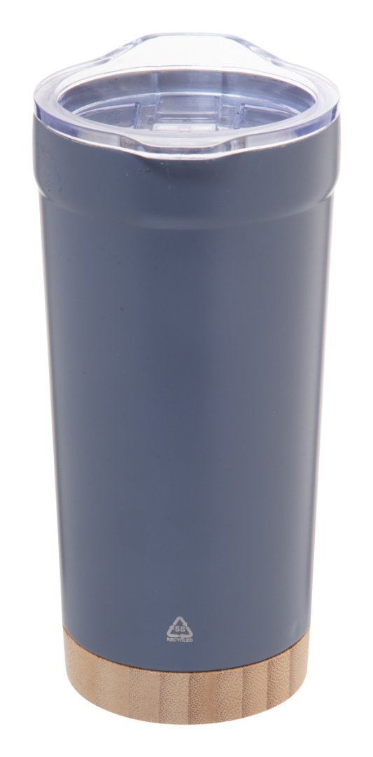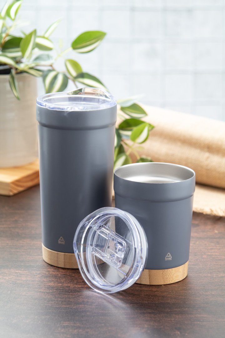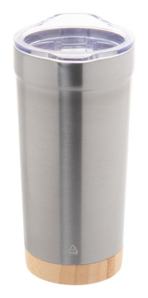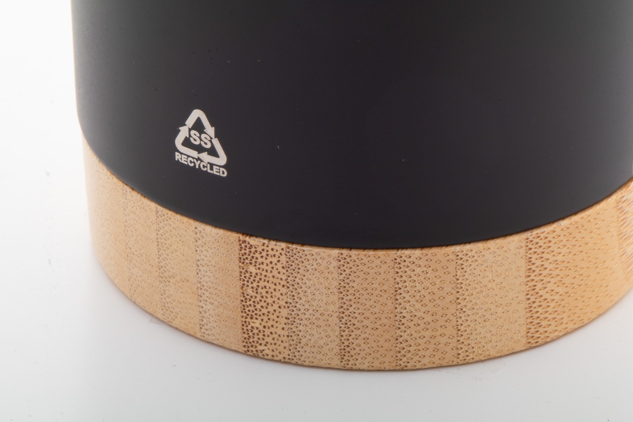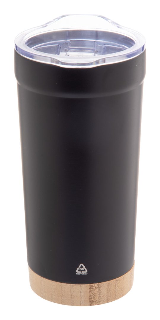 Duplafalú, újrahasznosított rozsdamentes acél vákuumszigetelt thermo pohár bambusz alappal és ABS műanyag ivófedéllel. 600 ml.