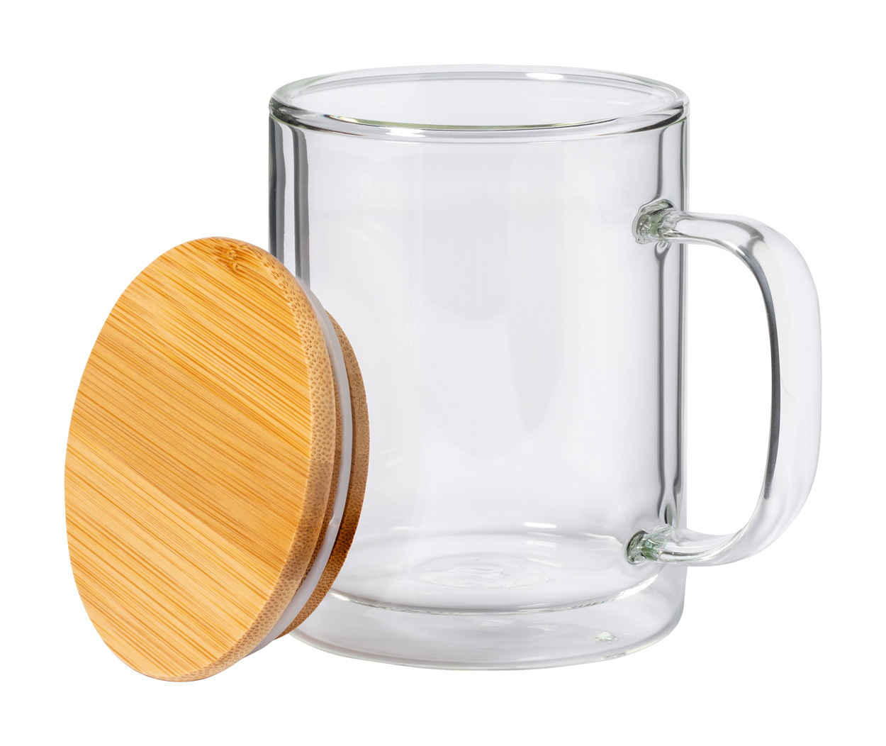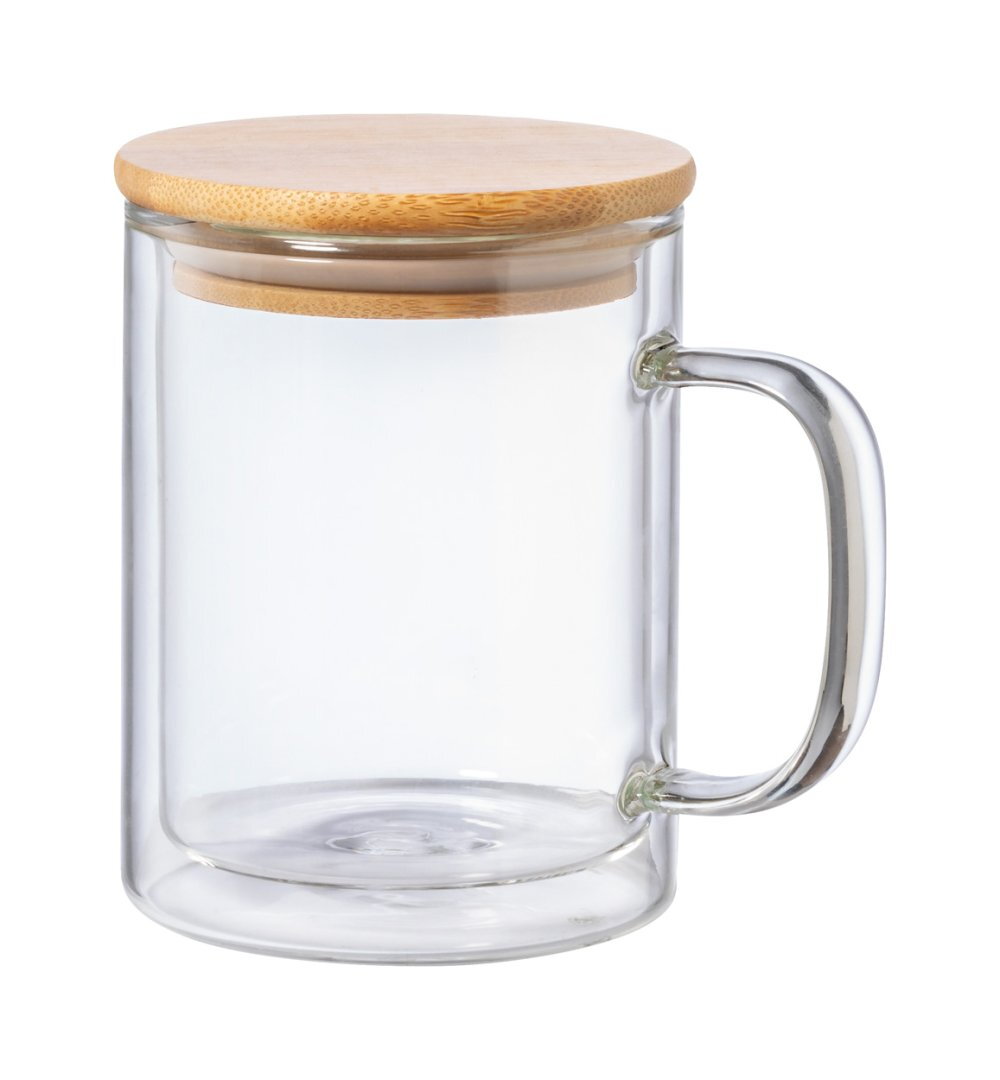 Duplafalú boroszilikát üvegből készült termo bögre fogantyúval és bambusz tetővel, 370 ml. Kraft papír dobozban szállítjuk.