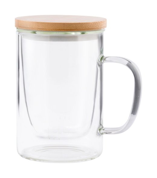 Boroszilikát üvegből készült bögre teafűtartóval és bambusz fedővel, 450 ml. Kraft papír dobozban szállítjuk.