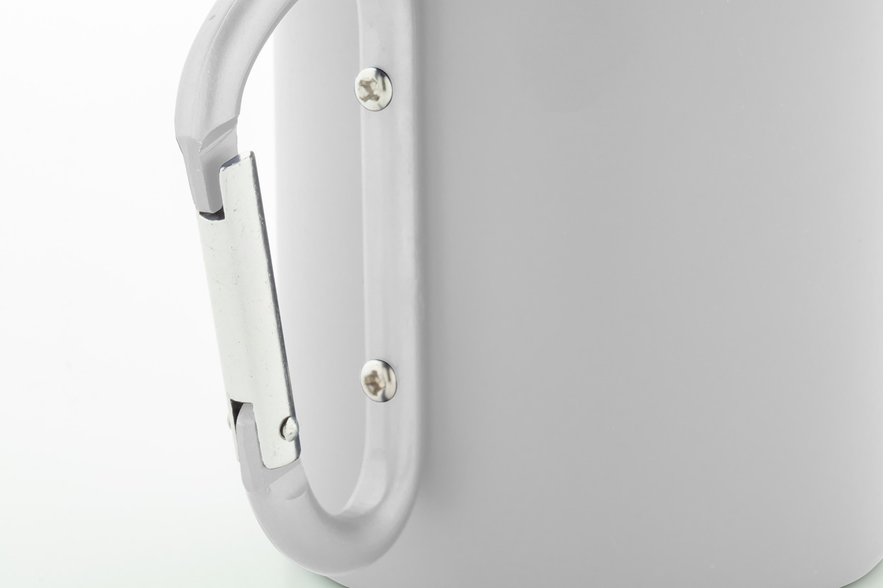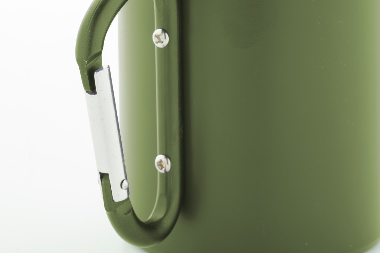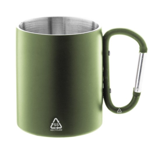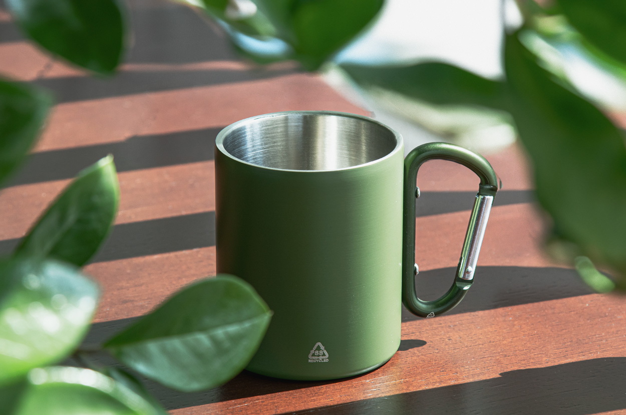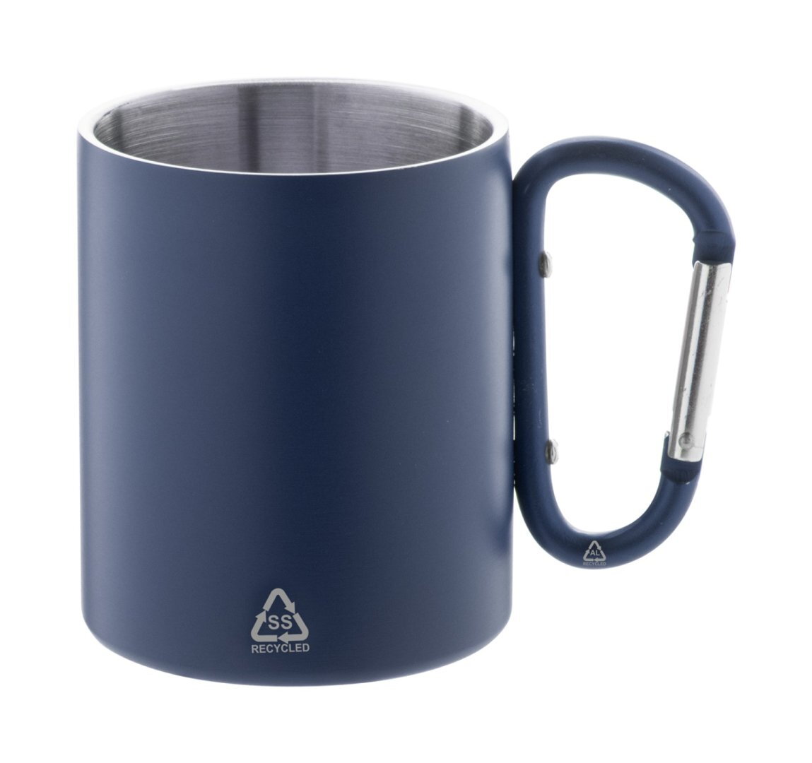 Duplafalú, újrahasznosított rozsdamentes acél thermo bögre, megegyező színű újrahasznosított alumínium karabineres fogantyúval. 300 ml. Kraft papír dobozban szállítjuk.