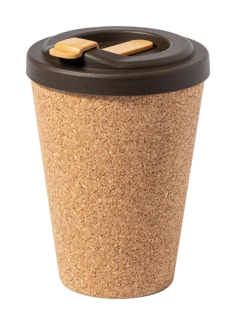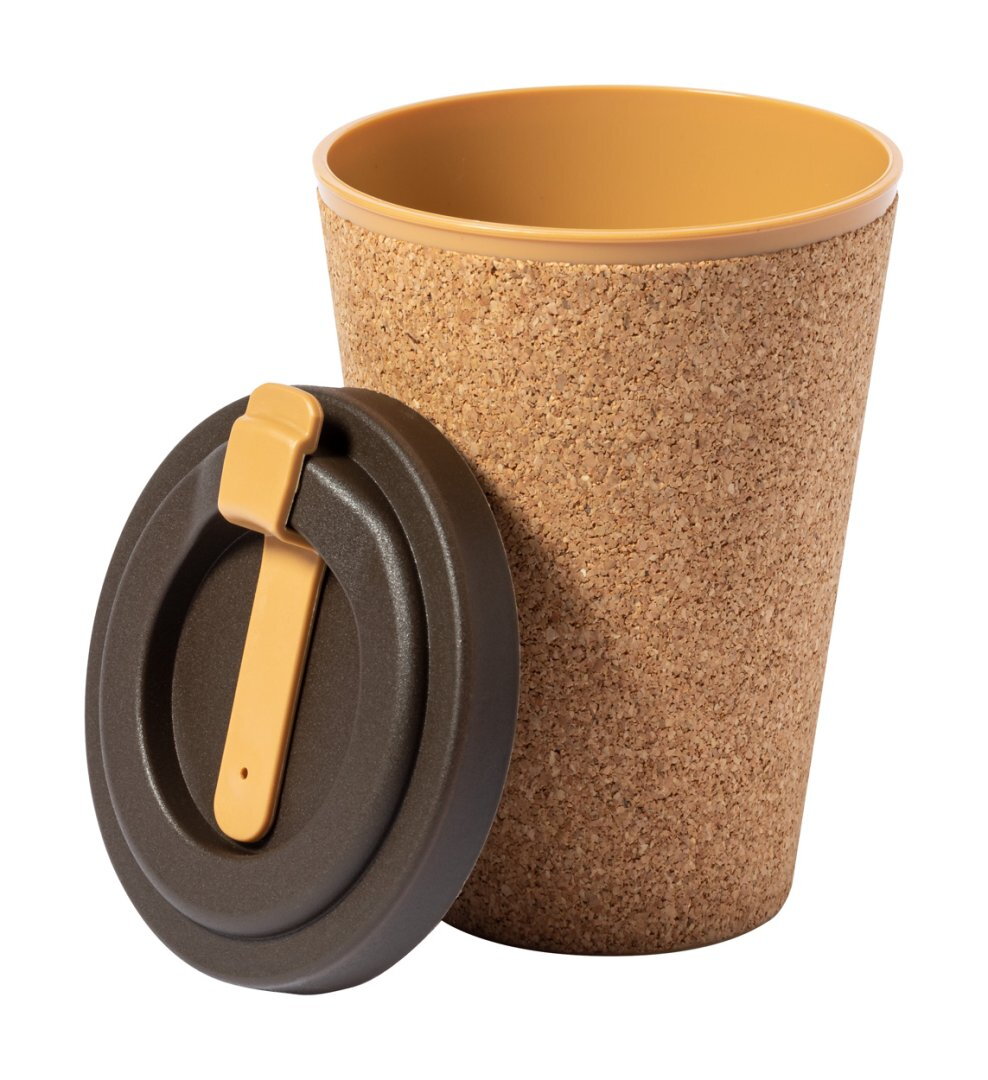 Természetes parafa bevonatú, duplafalú PP műanyag thermo bögre ivófedéllel. 350 ml, BPA mentes.