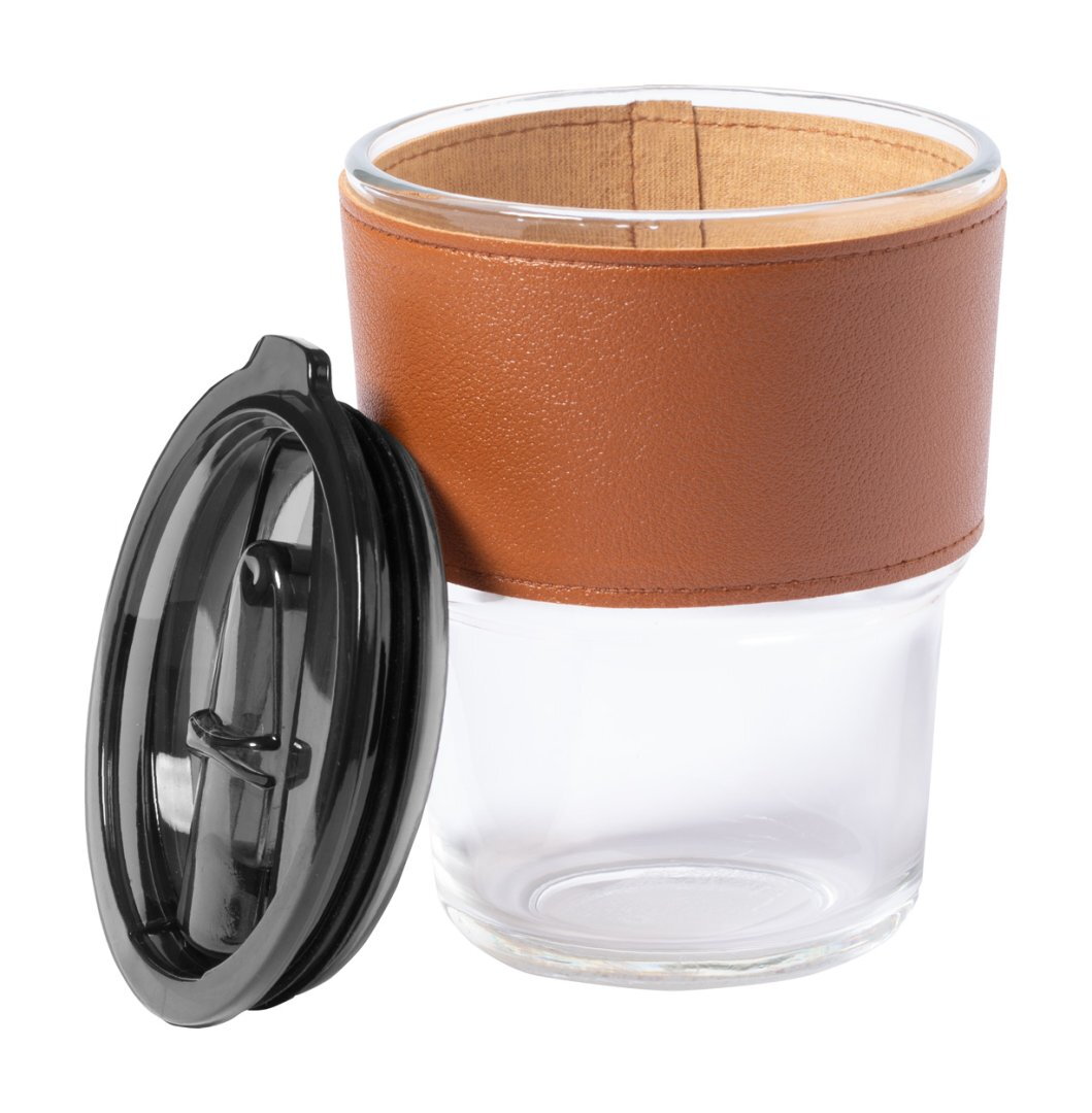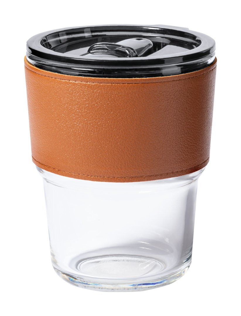 Egyfalú boroszilikát üveg utazóbögre, műbőr markolattal és műanyag ivófedéllel. 400 ml.