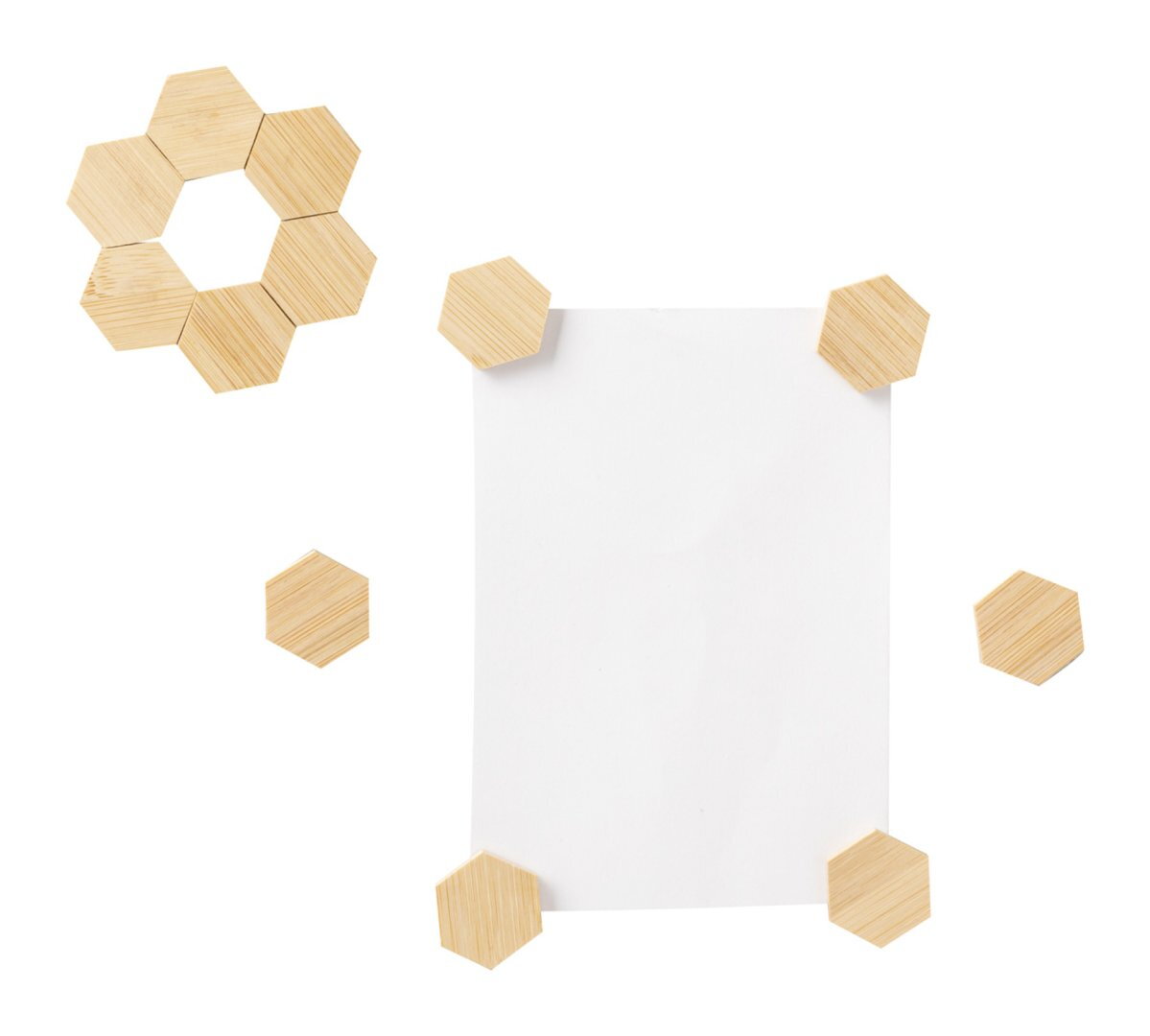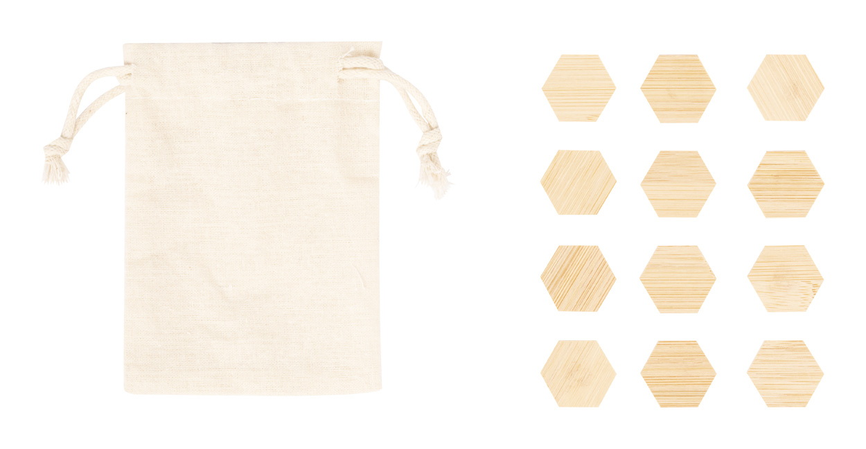 12 db-os bambusz hűtőmágnes készlet, pamut zsinóros tasakban.