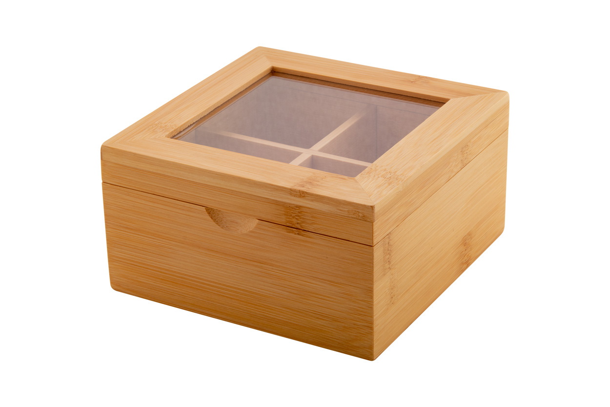 Bambusz teadoboz, átlátszó üveg tetővel és 4 rekesszel.