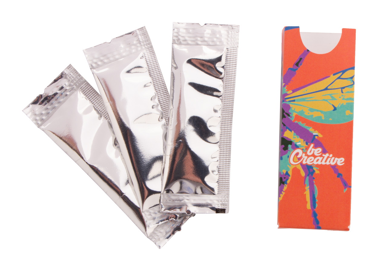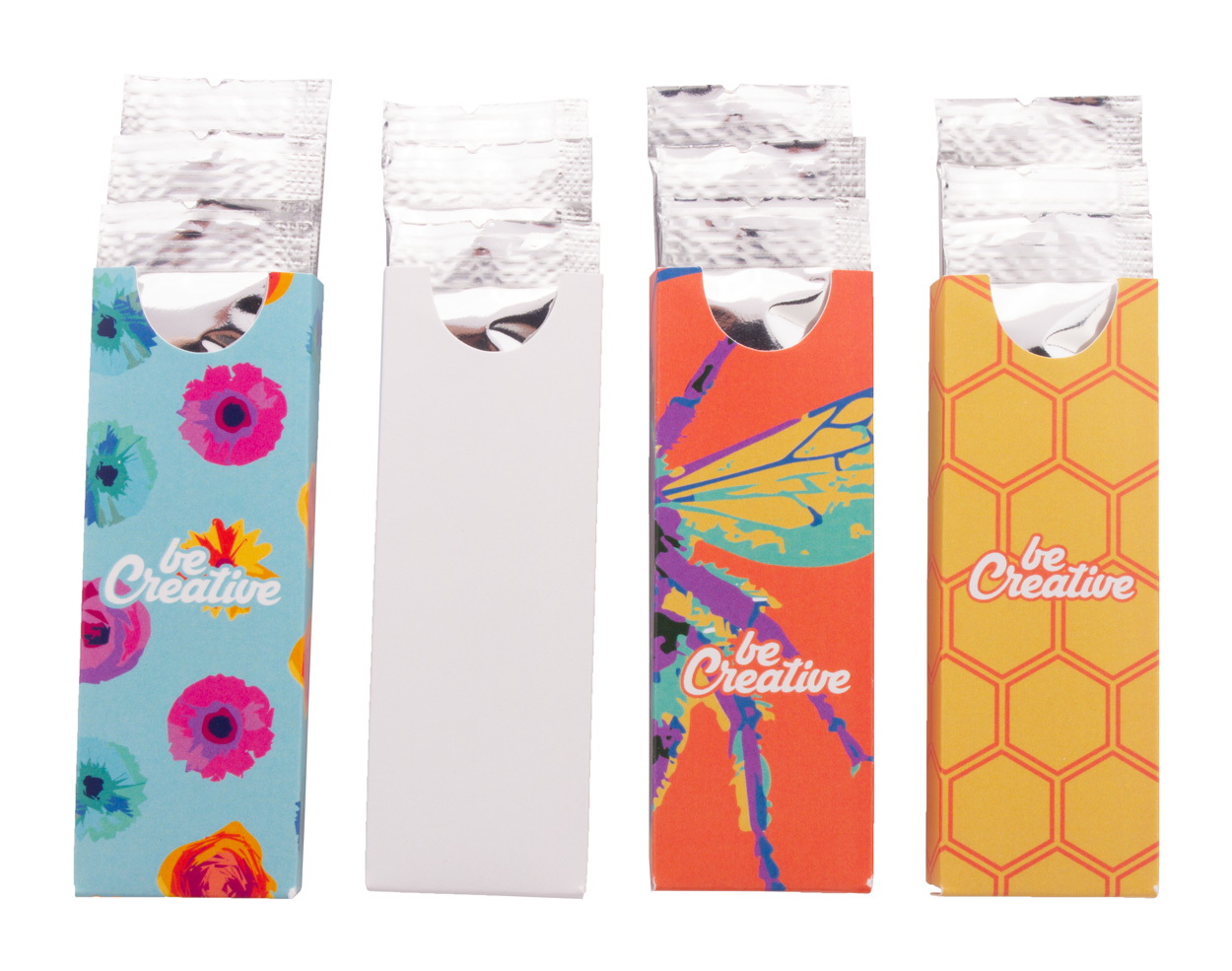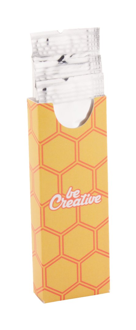 Három tasak méz (3x10 gramm) egyediesíthető, full colour emblémázású papírgyűrűben. Minimális rendelési mennyiség: 100 db.