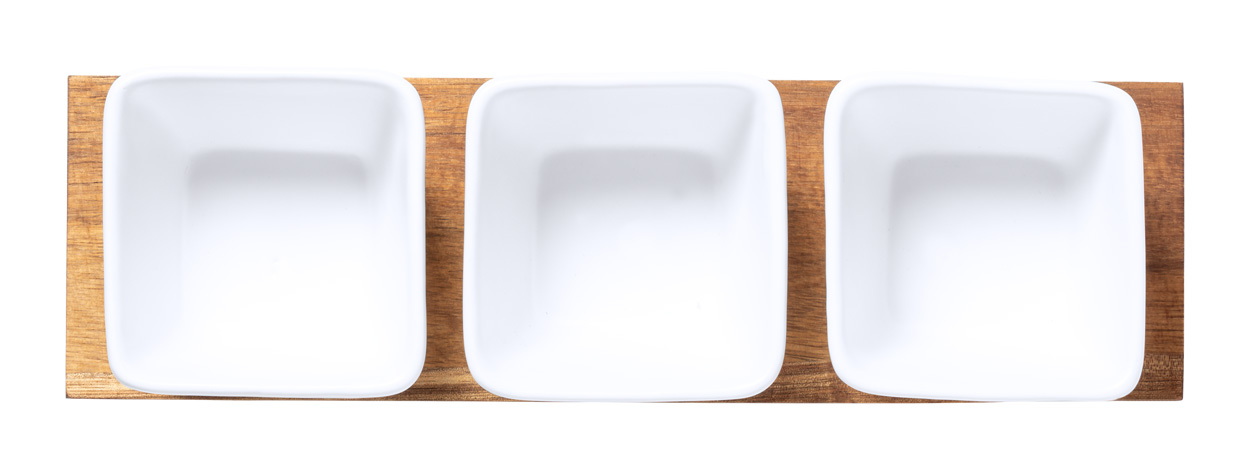 3 db-os, kerámiából készült tálalóedény szett fa tartóval.