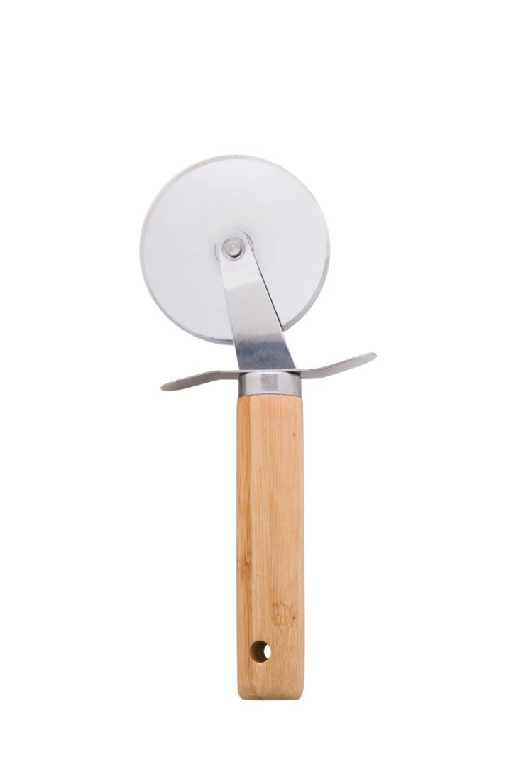 3 db-os, rozsdamentes acél pizza tálaló szett, bambusz fogantyúval, pamut tasakban. Egy sajtreszelőt, pizzavágót és spatulát tartalmaz.