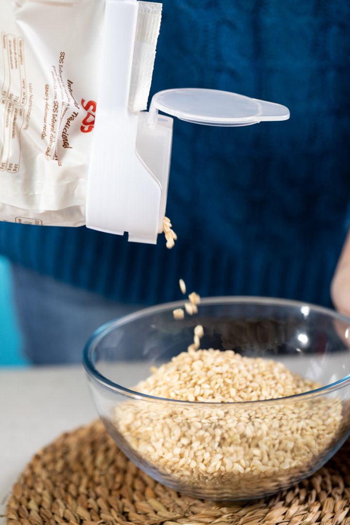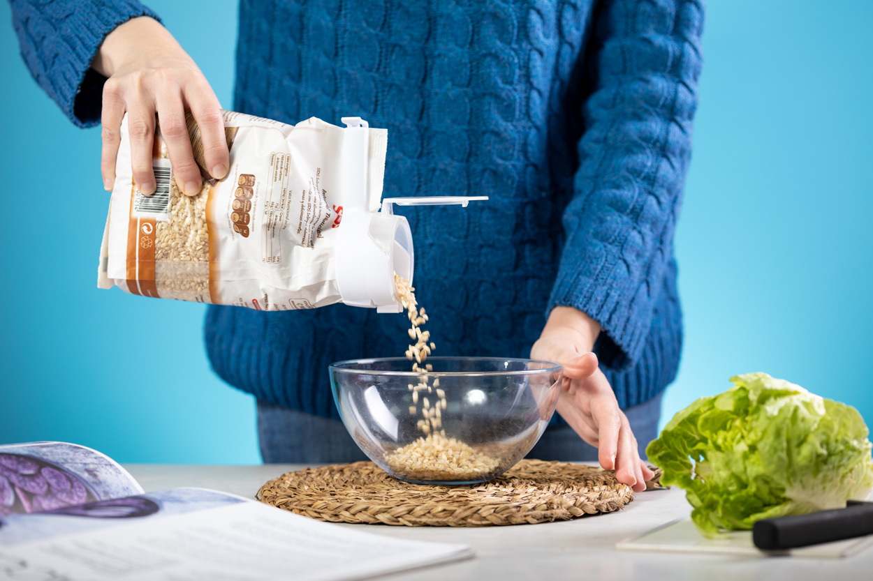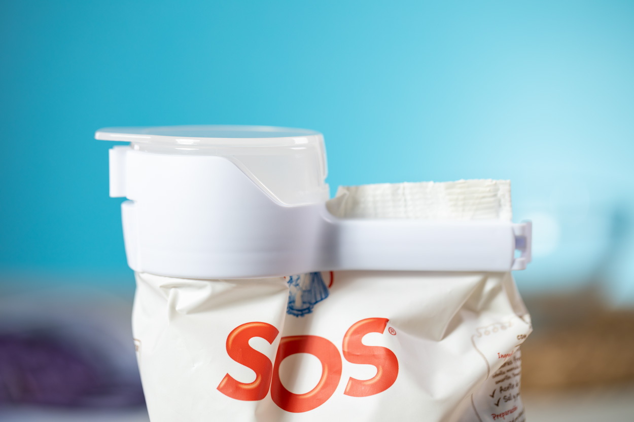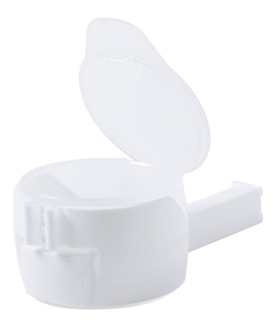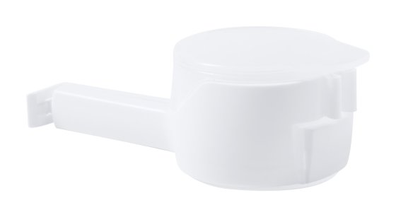 Műanyag tasakzáró csipesz, adagolóval a tetején.