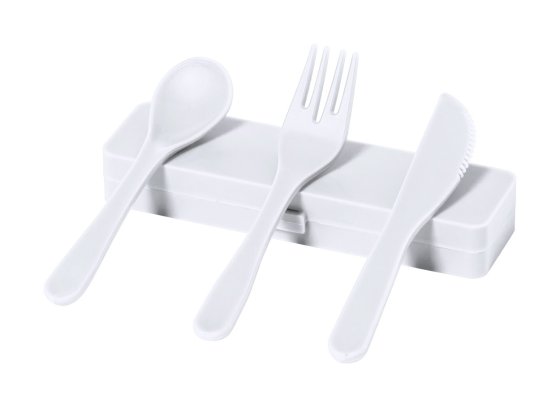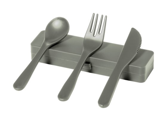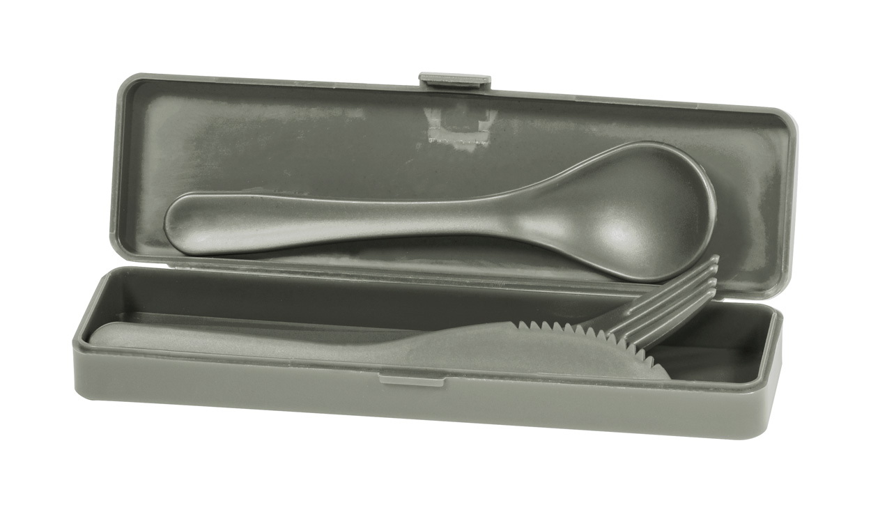 3 db-os újrahasznosított PP műanyag evőeszköz szett, újrahasznosított PP műanyag tartóban. Villát, kést és kanalat tartalmaz.