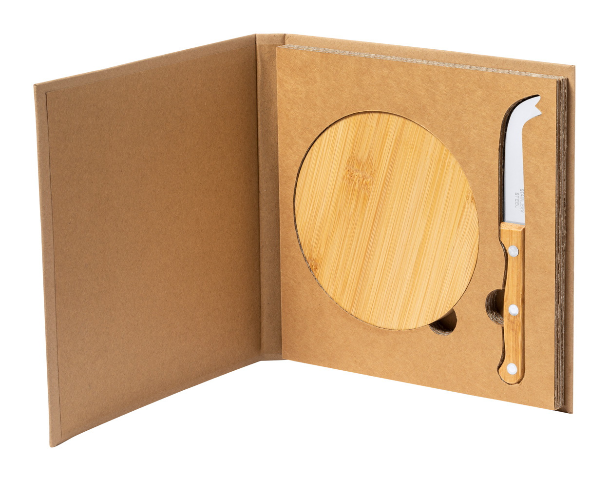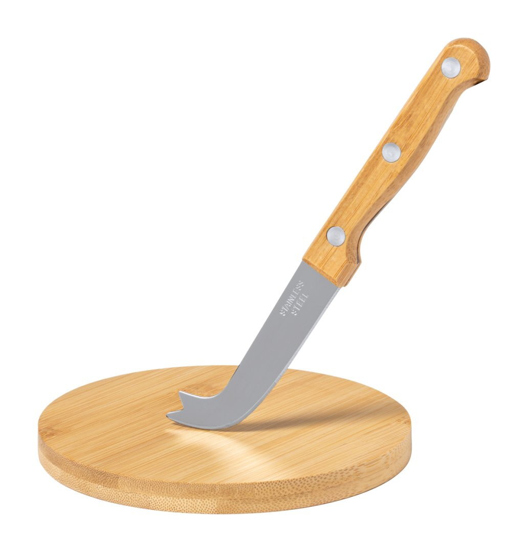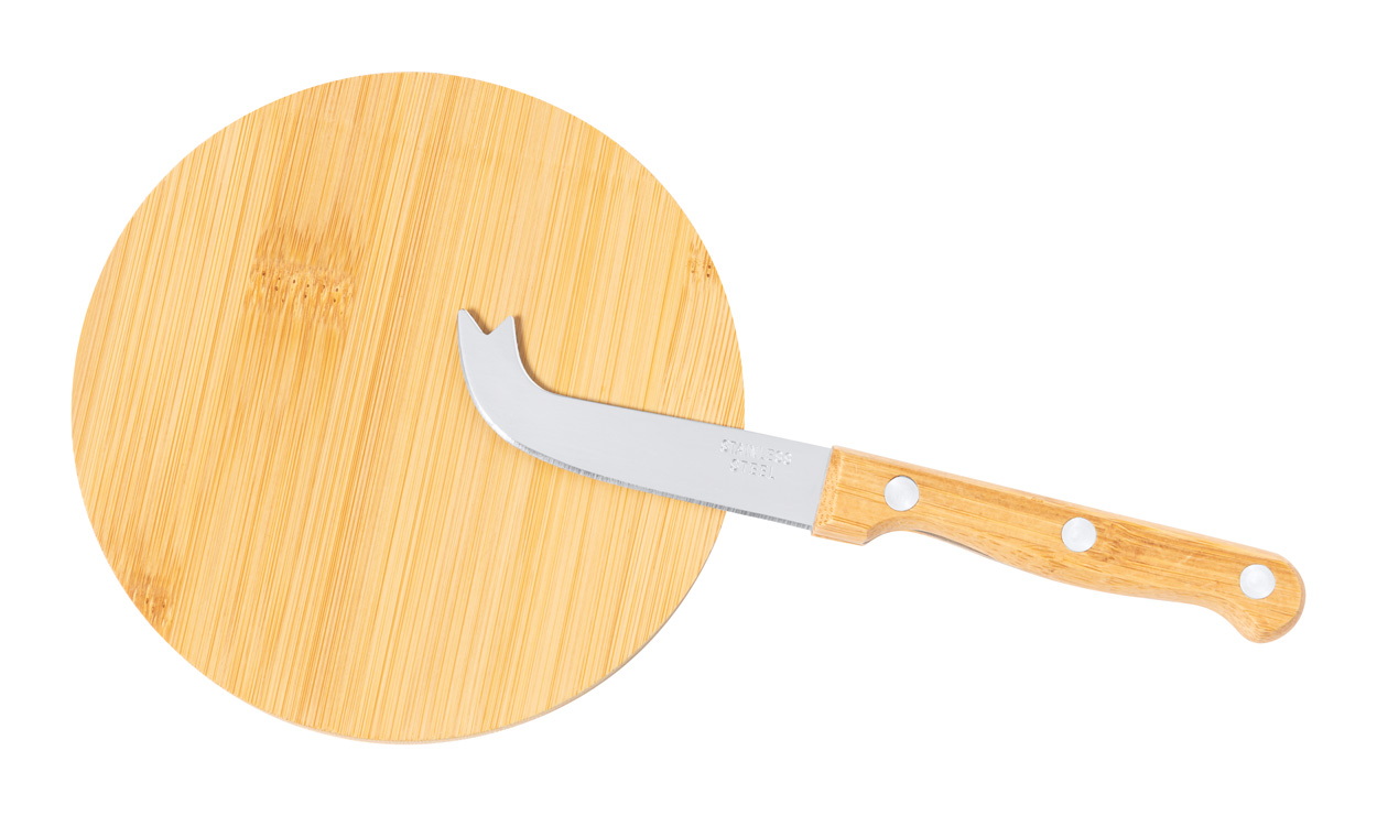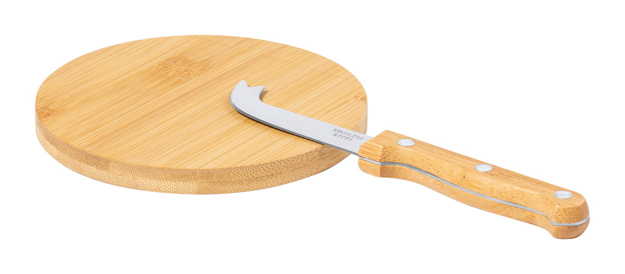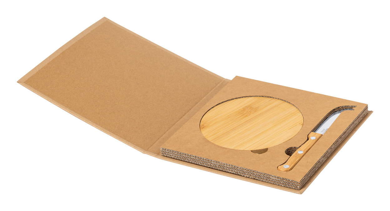 2 db-os sajtkésszett bambusz nyelű rozsdamentes acél késsel, és kerek bambusz vágódeszkával. Kraft papír dobozban.
