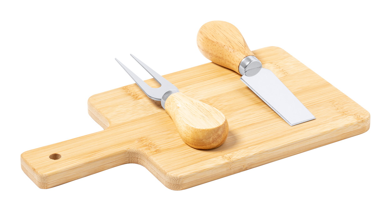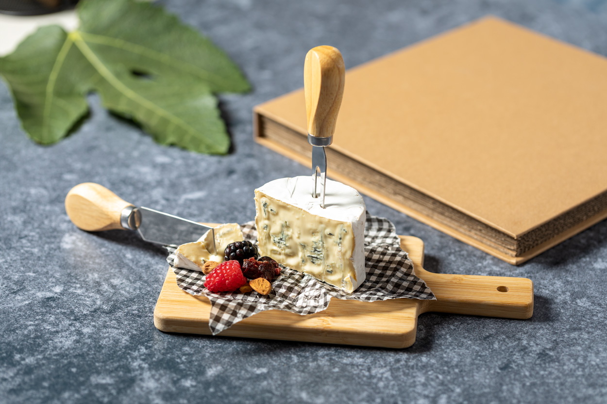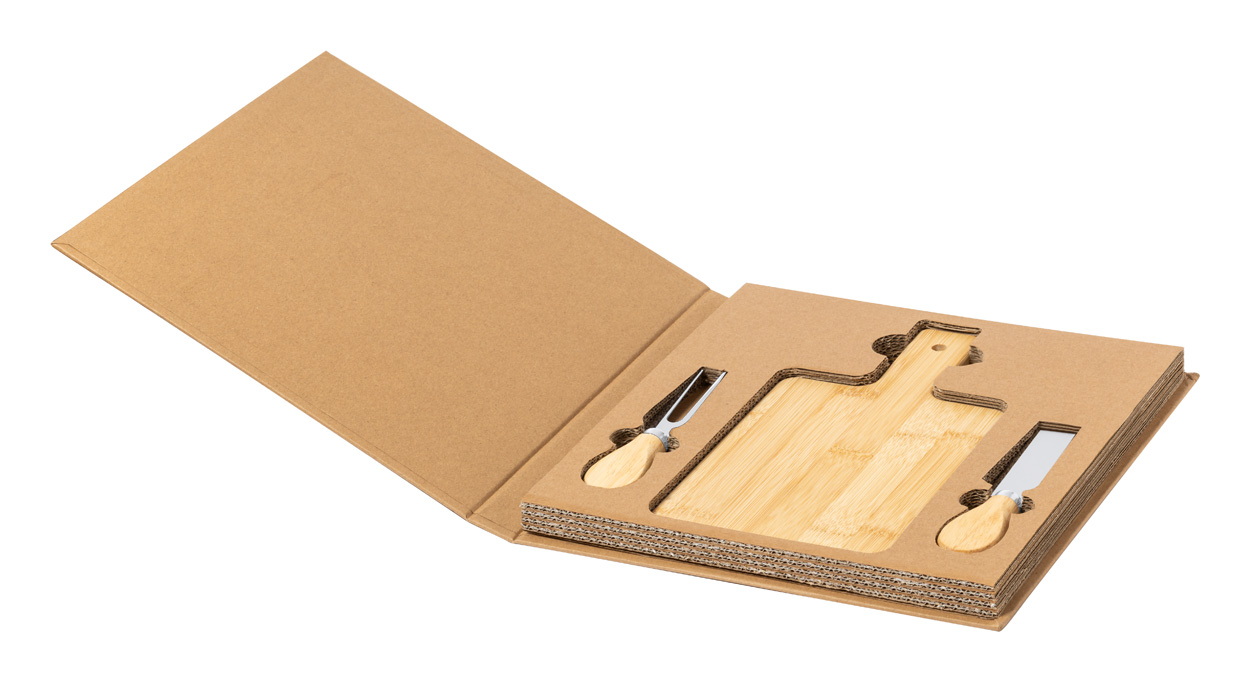 3 db-os sajtszett rozsdamentes acél villával és késsel, bambusz markolattal és bambusz vágódeszkával, fogantyúval. Kraft papír dobozban.