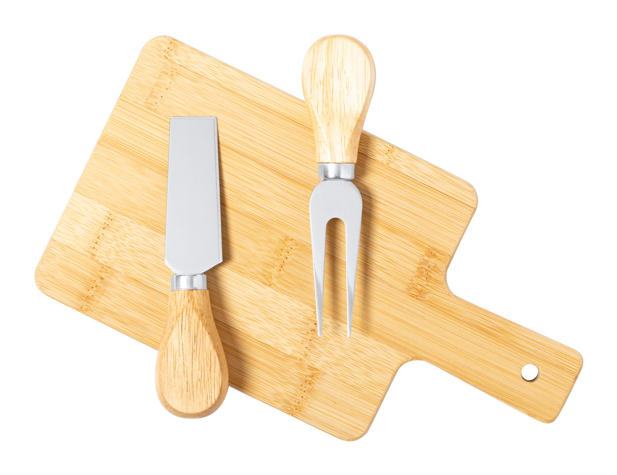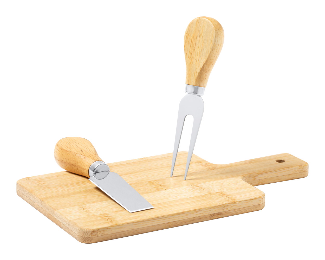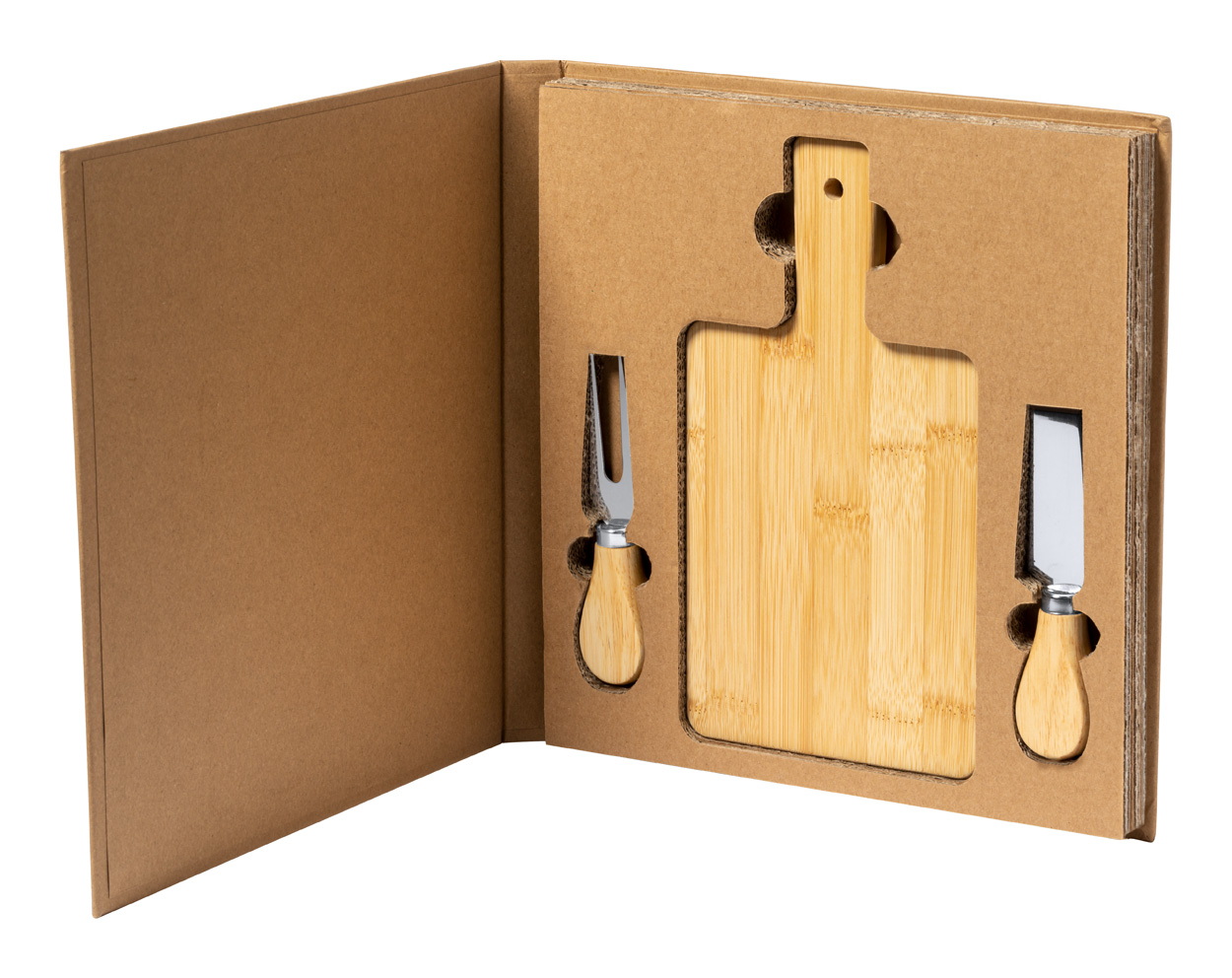 3 db-os sajtszett rozsdamentes acél villával és késsel, bambusz markolattal és bambusz vágódeszkával, fogantyúval. Kraft papír dobozban.