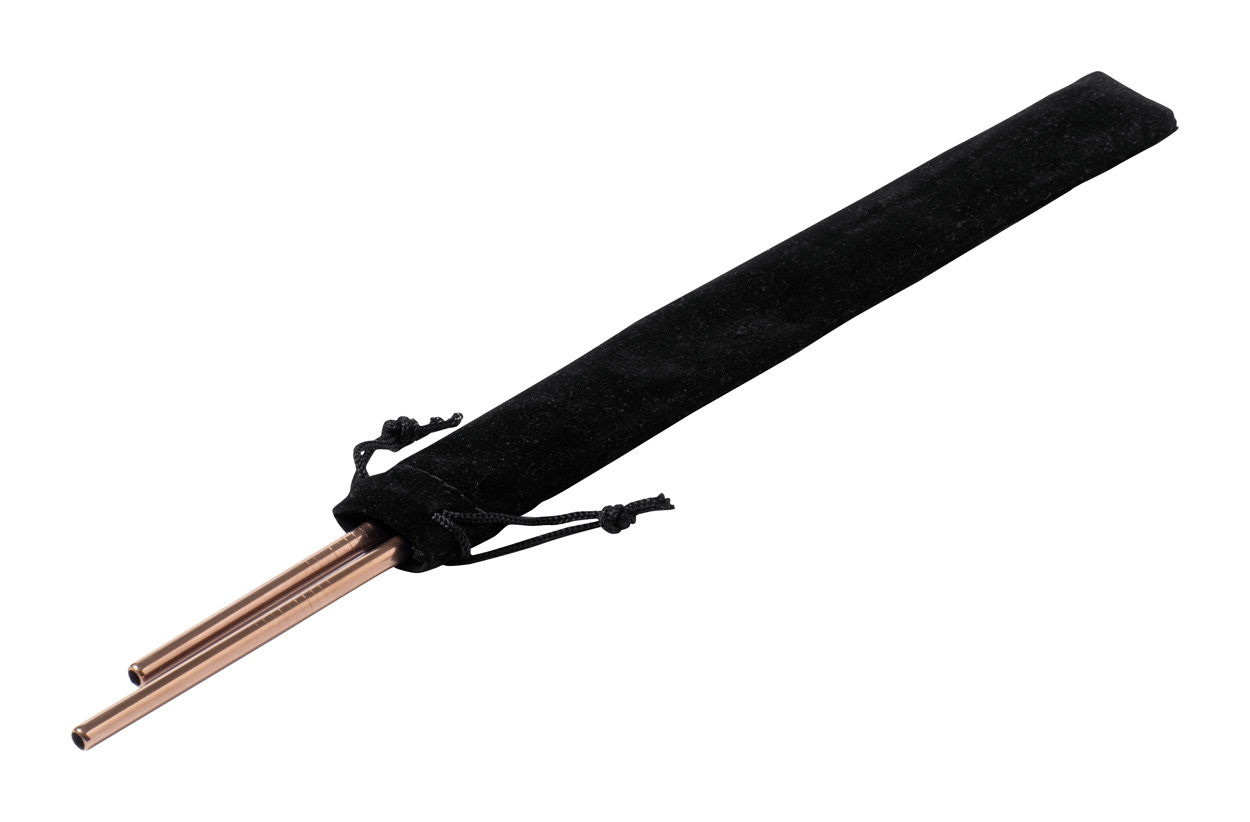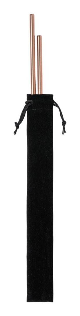 2 darab újrahasználható, rézbevonatú, rozsdamentes acél szívószál tisztítókefével. Bársony tasakban.