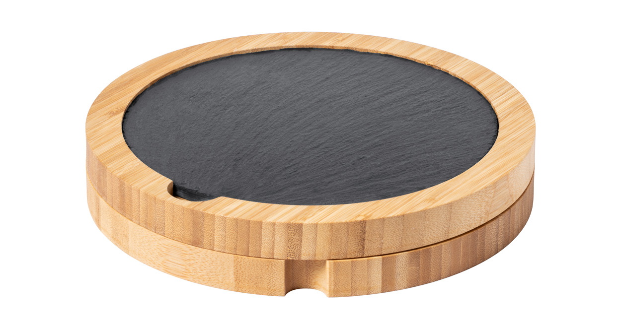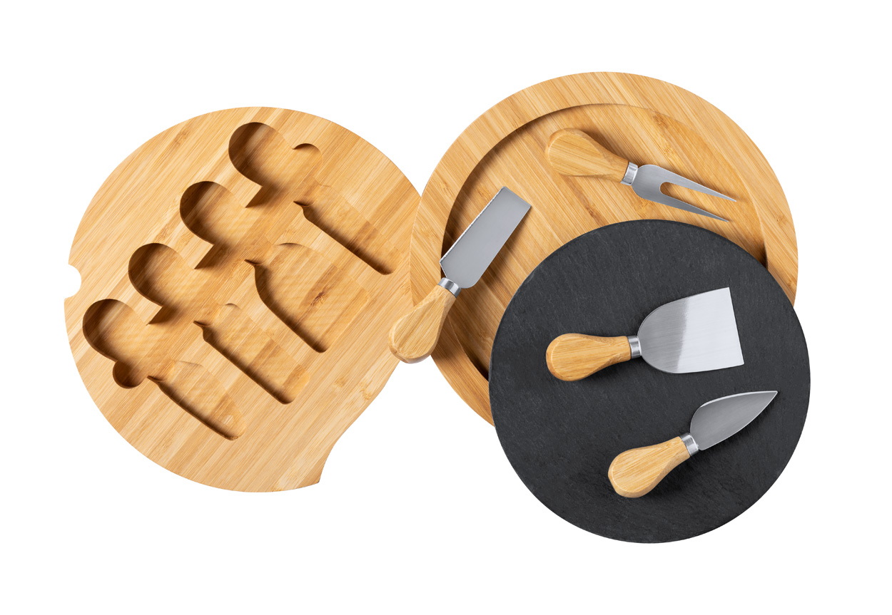 Kerek alakú bambusz vágódeszka palatáblával és 4 db rozsdamentes acél sajtkéskészlettel.