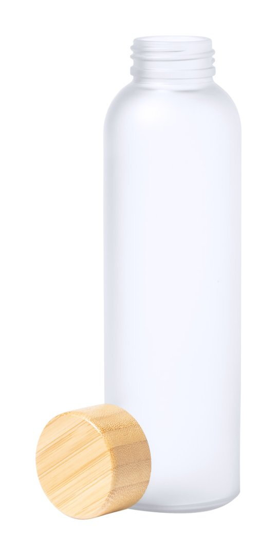 Szublimációs emblémázásra alkalmas üveg sportkulacs bambuszkupakkal, 500 ml. Nem alkalmas szénsavas italok tárolására.