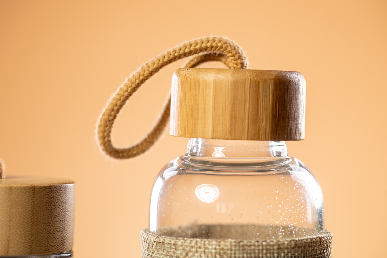 Üveg sportkulacs, természetes színű poliészter borítással, bambusz fedéllel és hordpánttal, 500 ml.