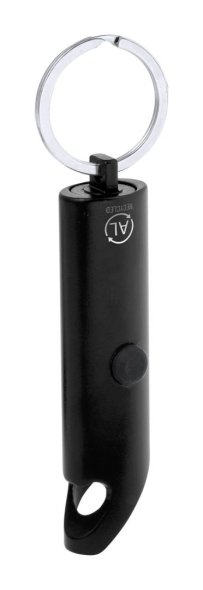Mini, újrahasznosított alumínium elemlámpa 3 LED-del, üvegnyitóval és kulcstartóval. Gombelemmel szállítjuk.