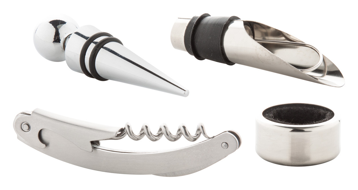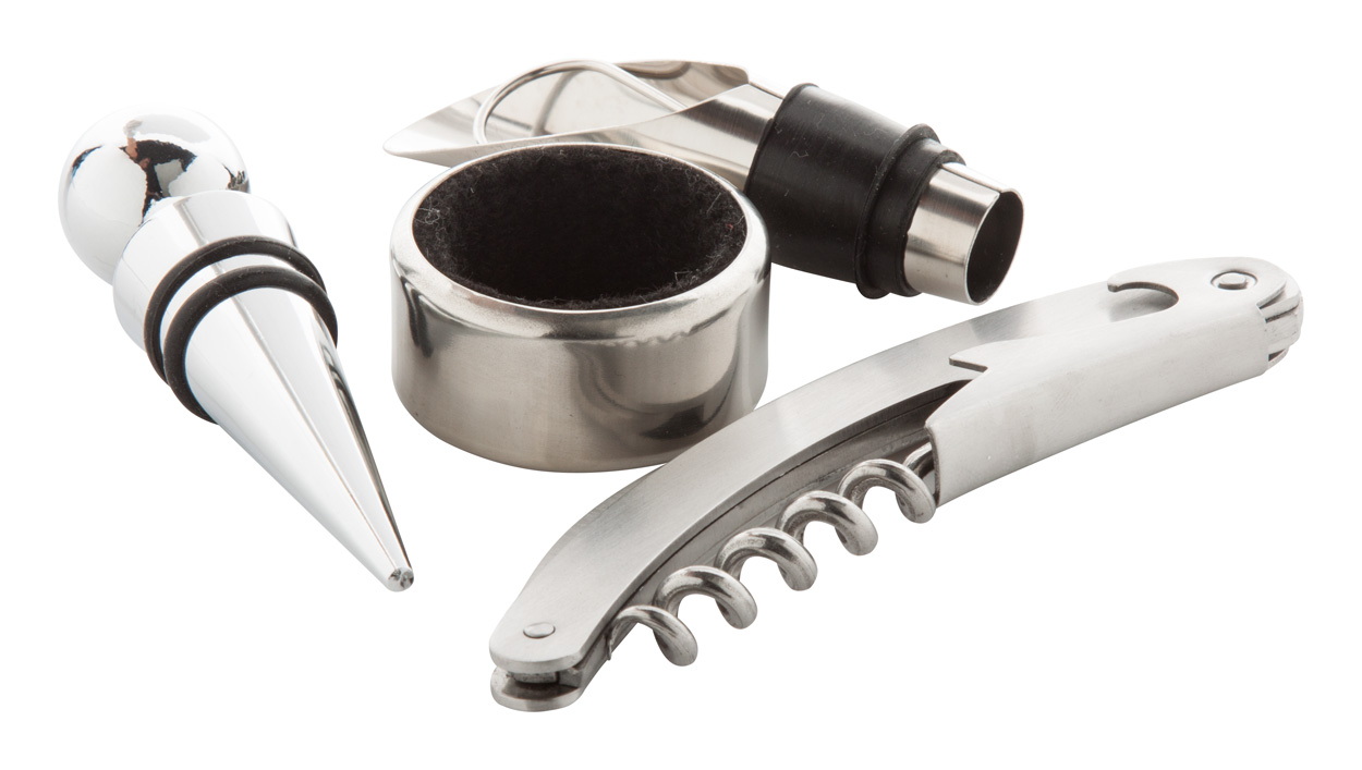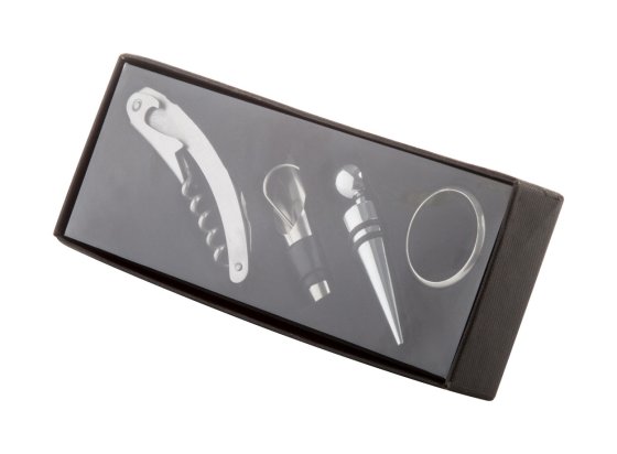 4 részes boros szett, mely dugóhúzót, cseppőrt, dugót és kiöntőt tartalmaz. Fekete díszdobozban szállítjuk.