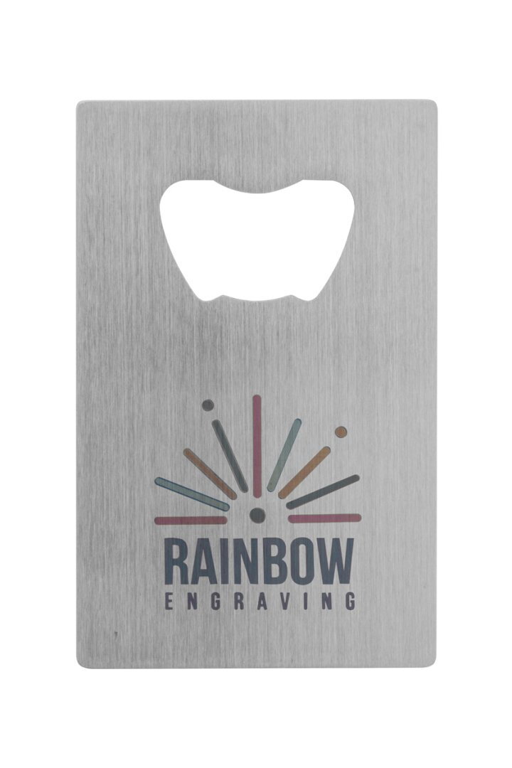 Rozsdamentes acélból készült bankártya alakú üvegnyitó.
