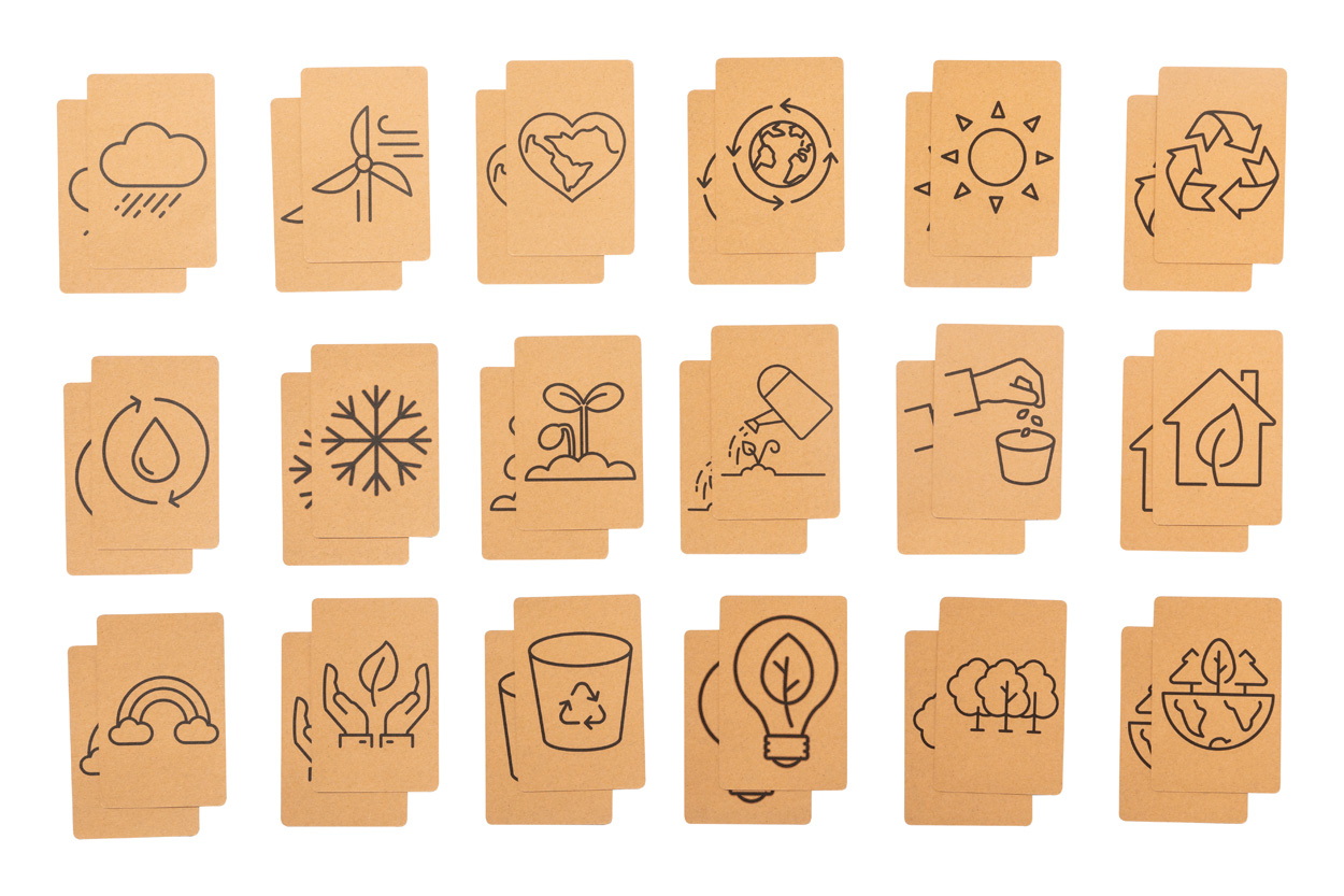 Újrahasznosított karton memóriajáték, 36 db környezetvédelmi tematikájú kártyával. Újrahasznosított kartondobozban.