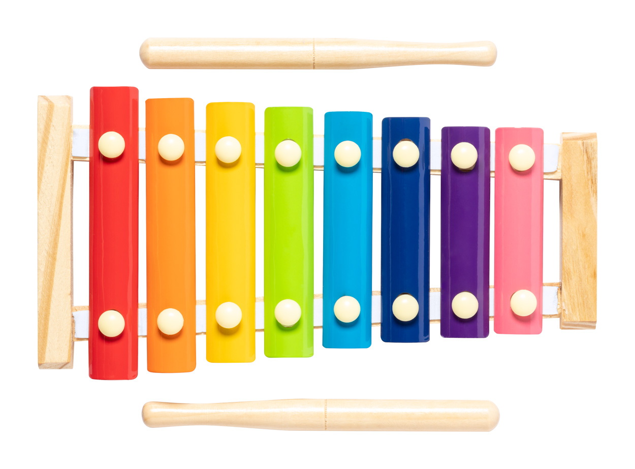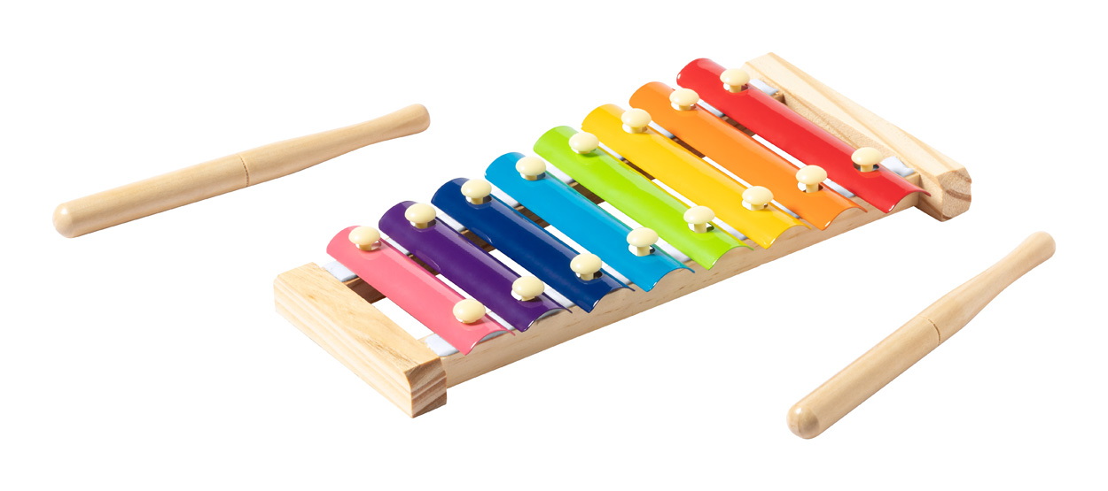 Fa xilofon, dobverővel és színes fém billentyűkkel.