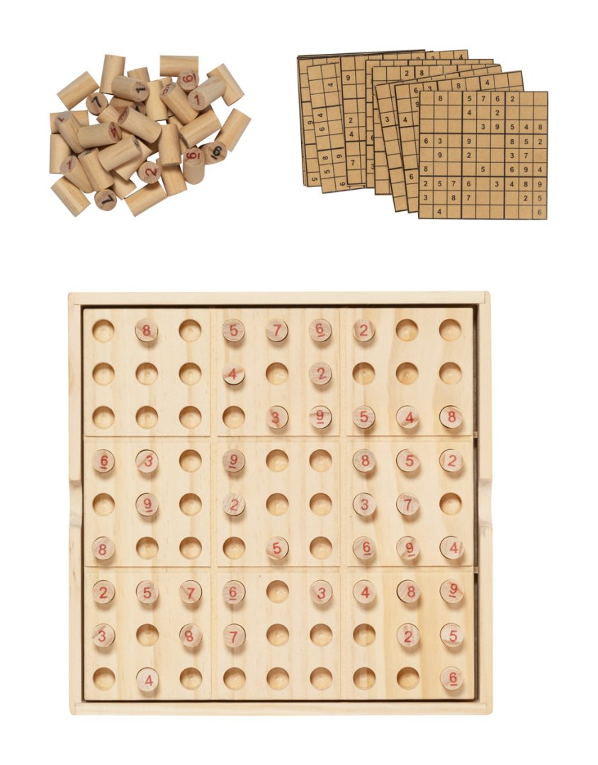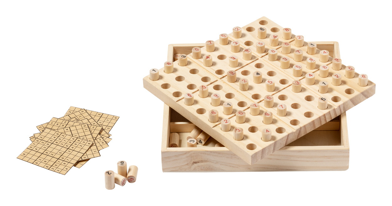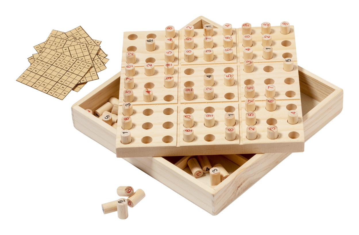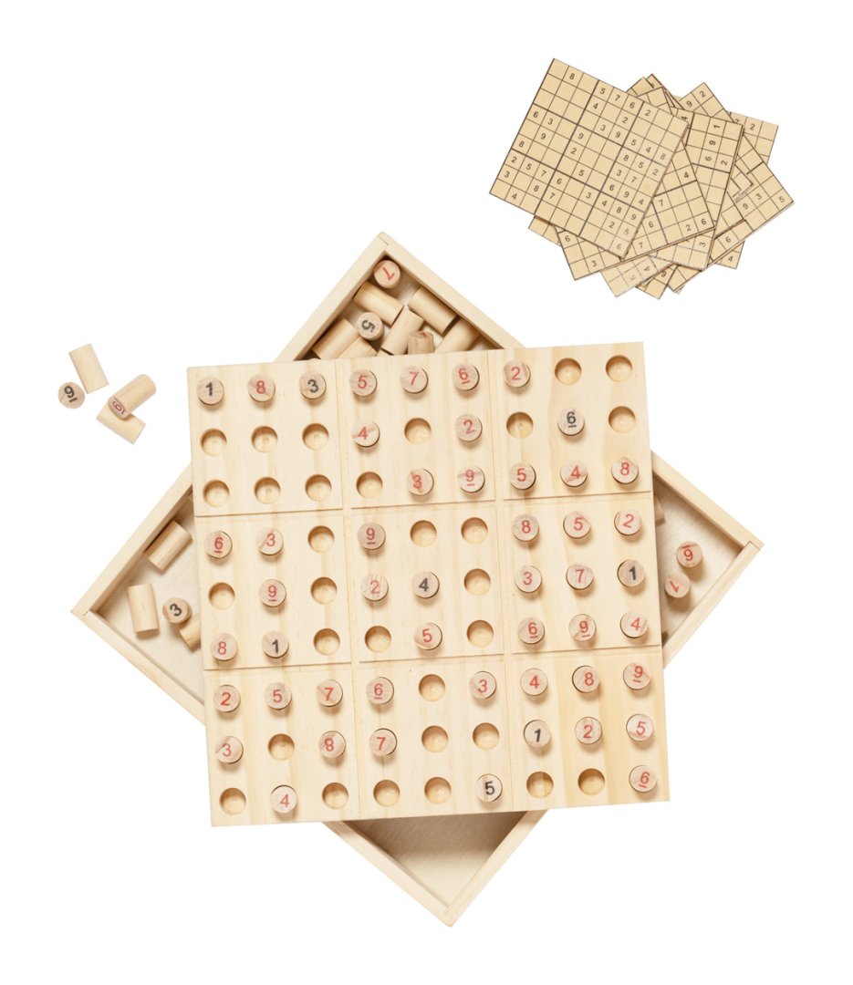 Fa sudoku ügyességi játék 81 számozott figurával és 10 kártyával.