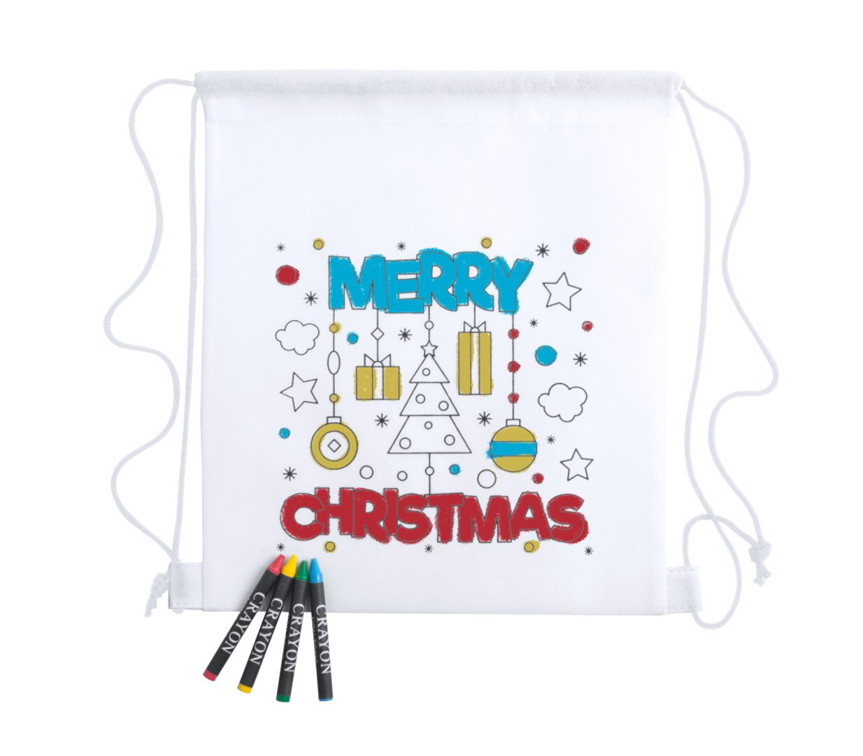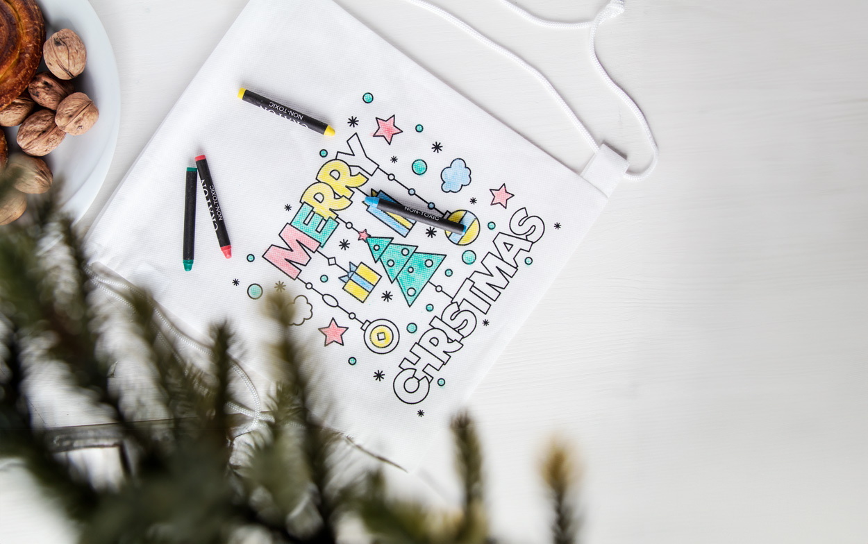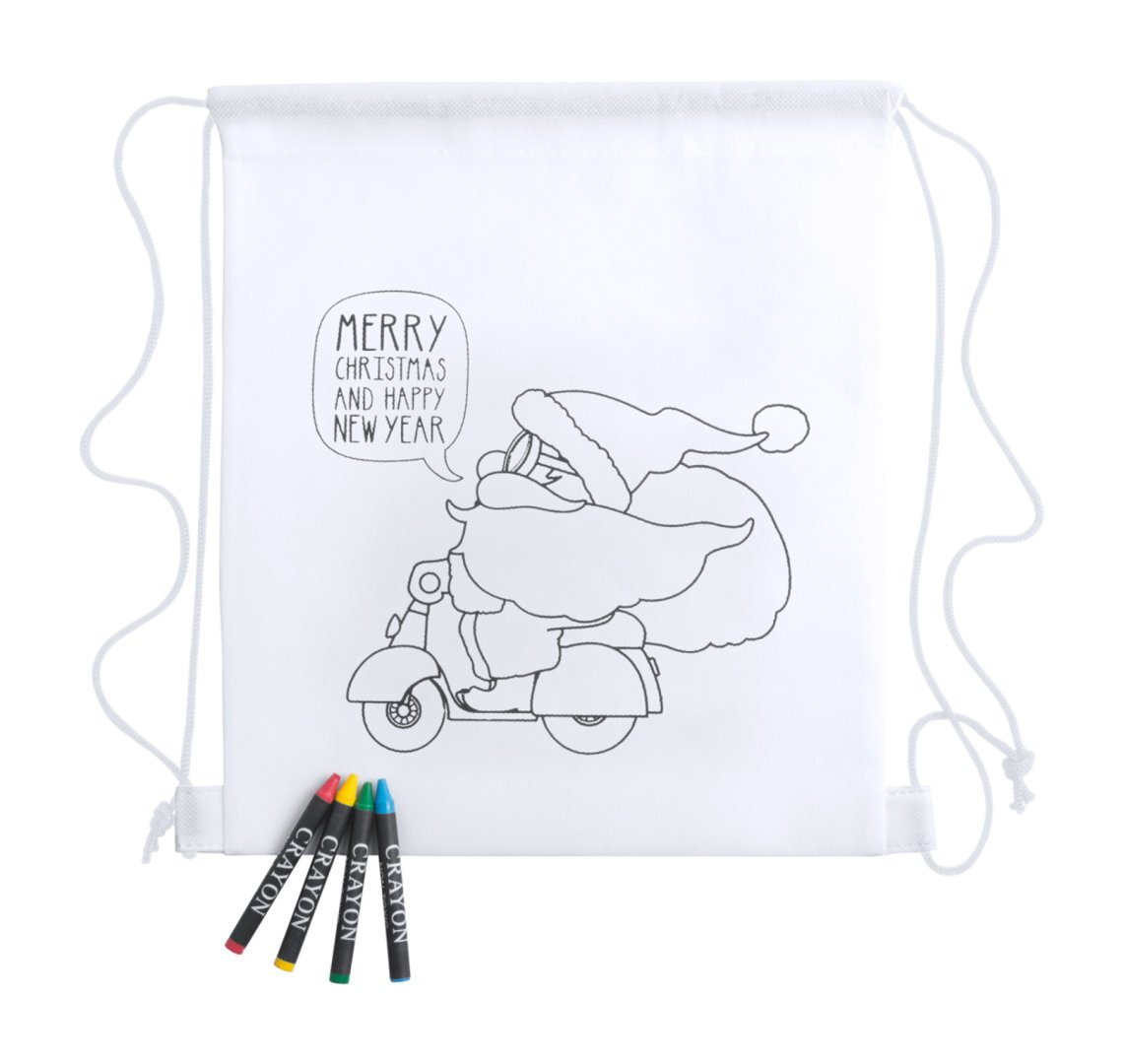 Non-woven anyagból készült színezhető hátizsák karácsonyi mintával és 4 db zsírkrétával. Anyaga: 80 g/m².