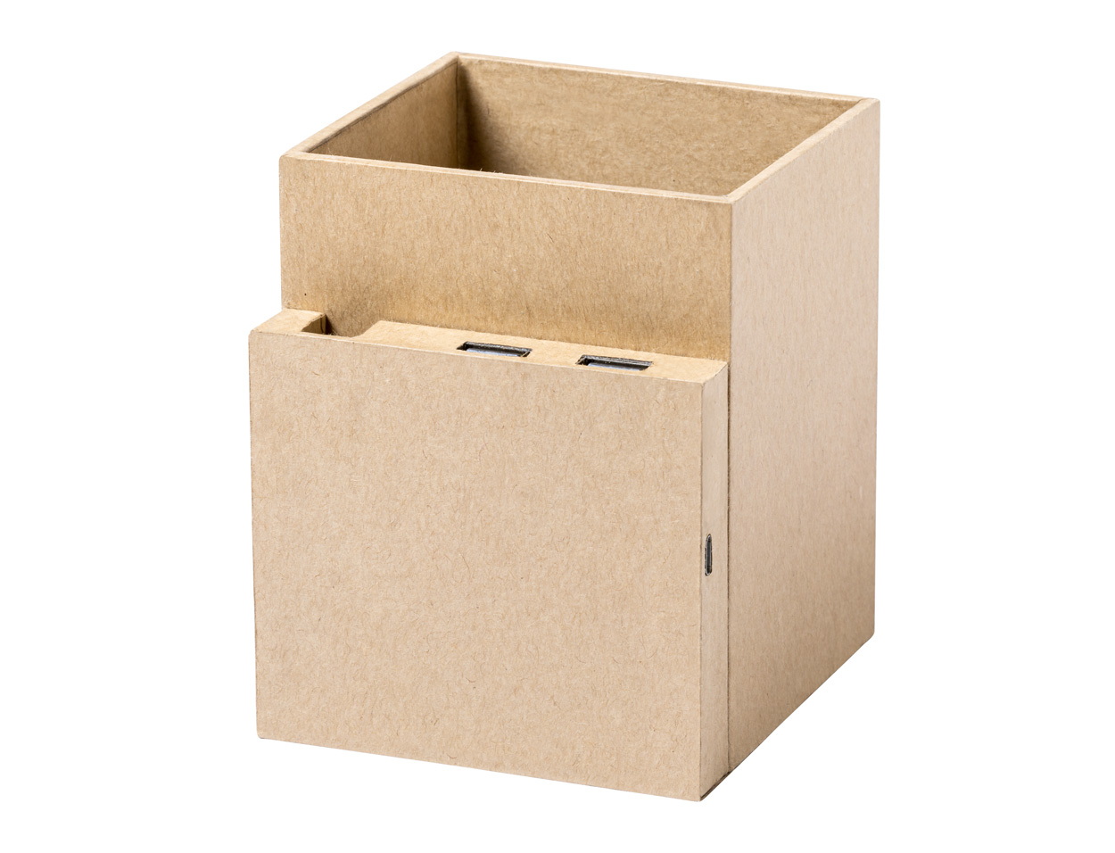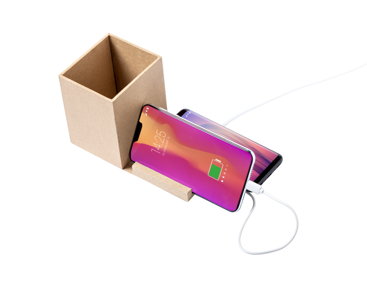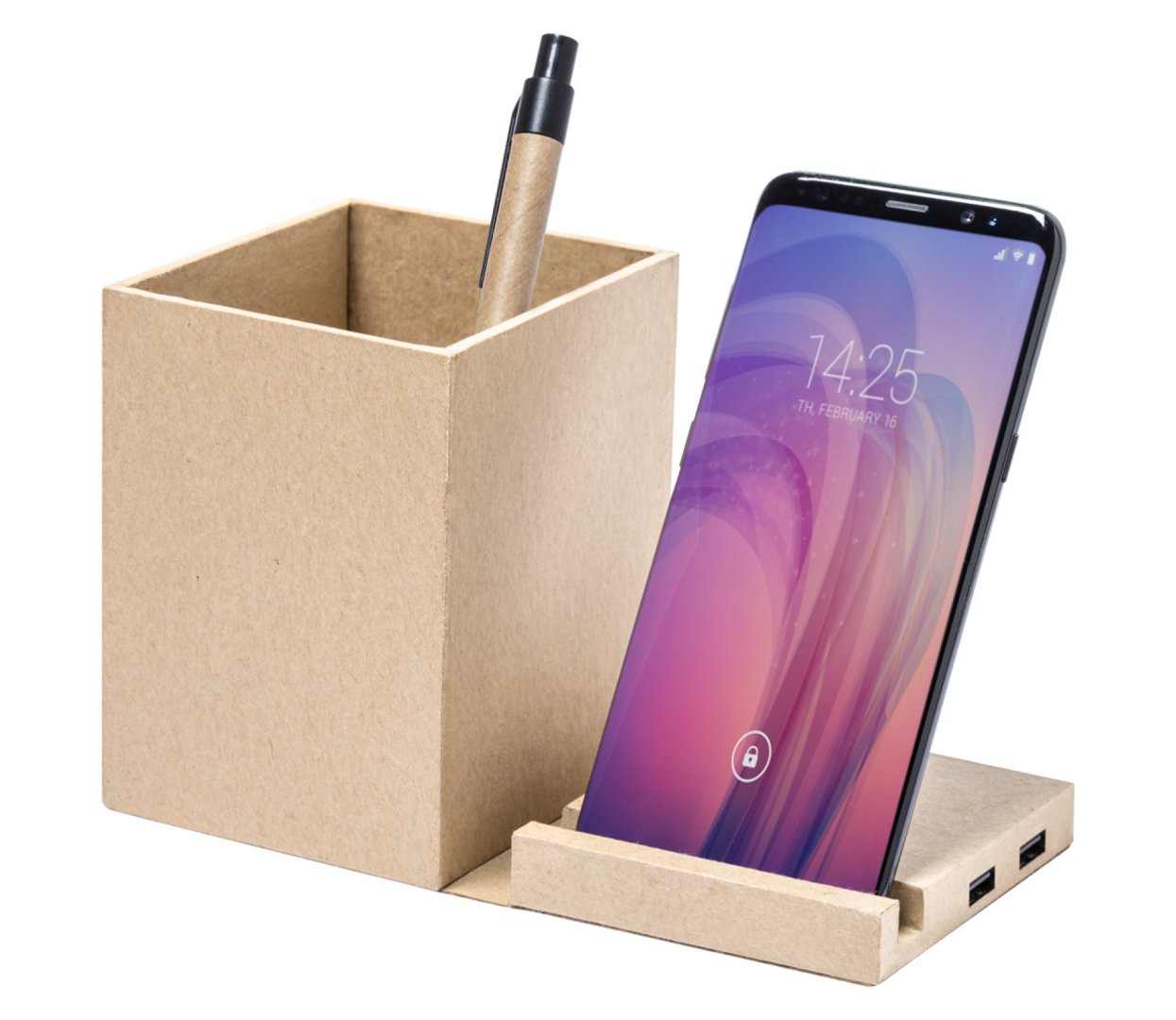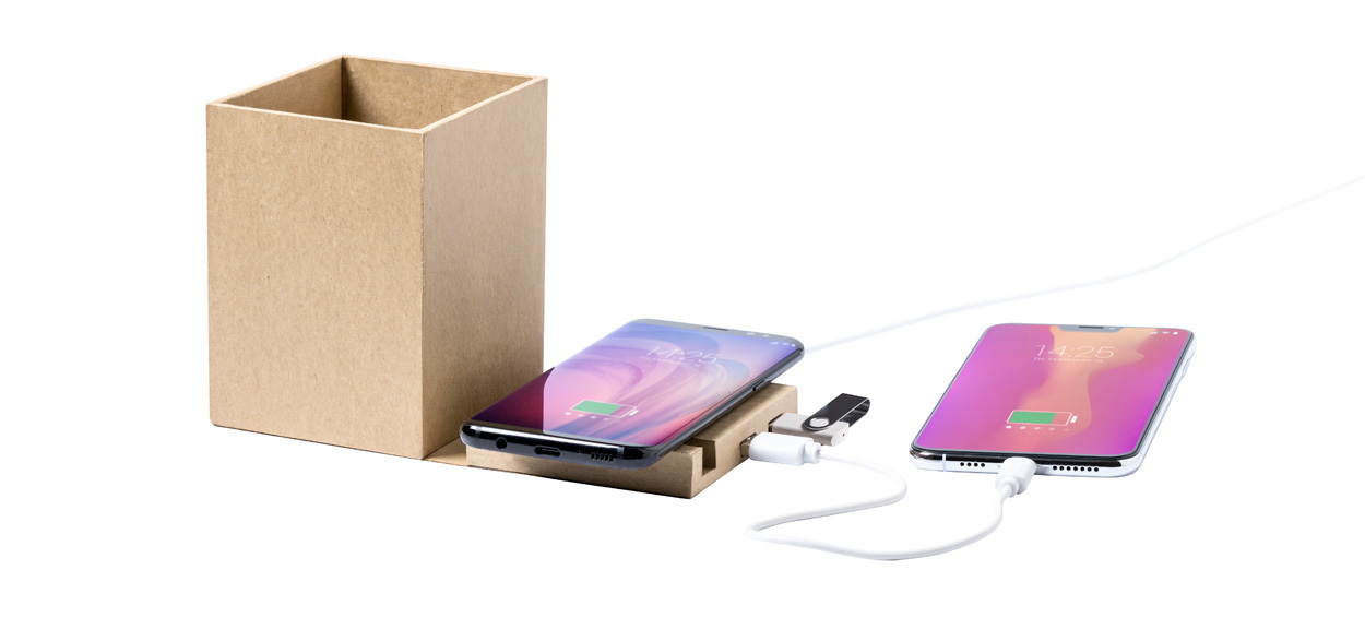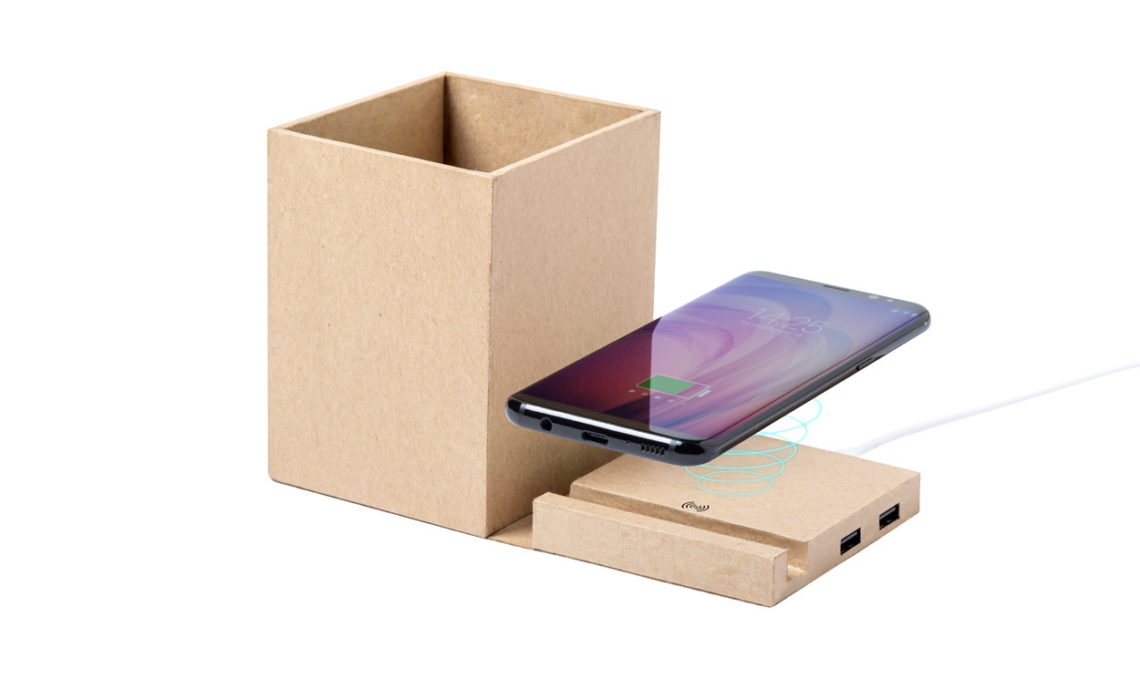 Multifunkciós tolltartó újrahasznosított borítású mobiltelefon tartóval, vezeték nélküli töltővel. Két USB 2.0 porttal és USB-C csatlakozóval. USB töltőkábellel szállítjuk.