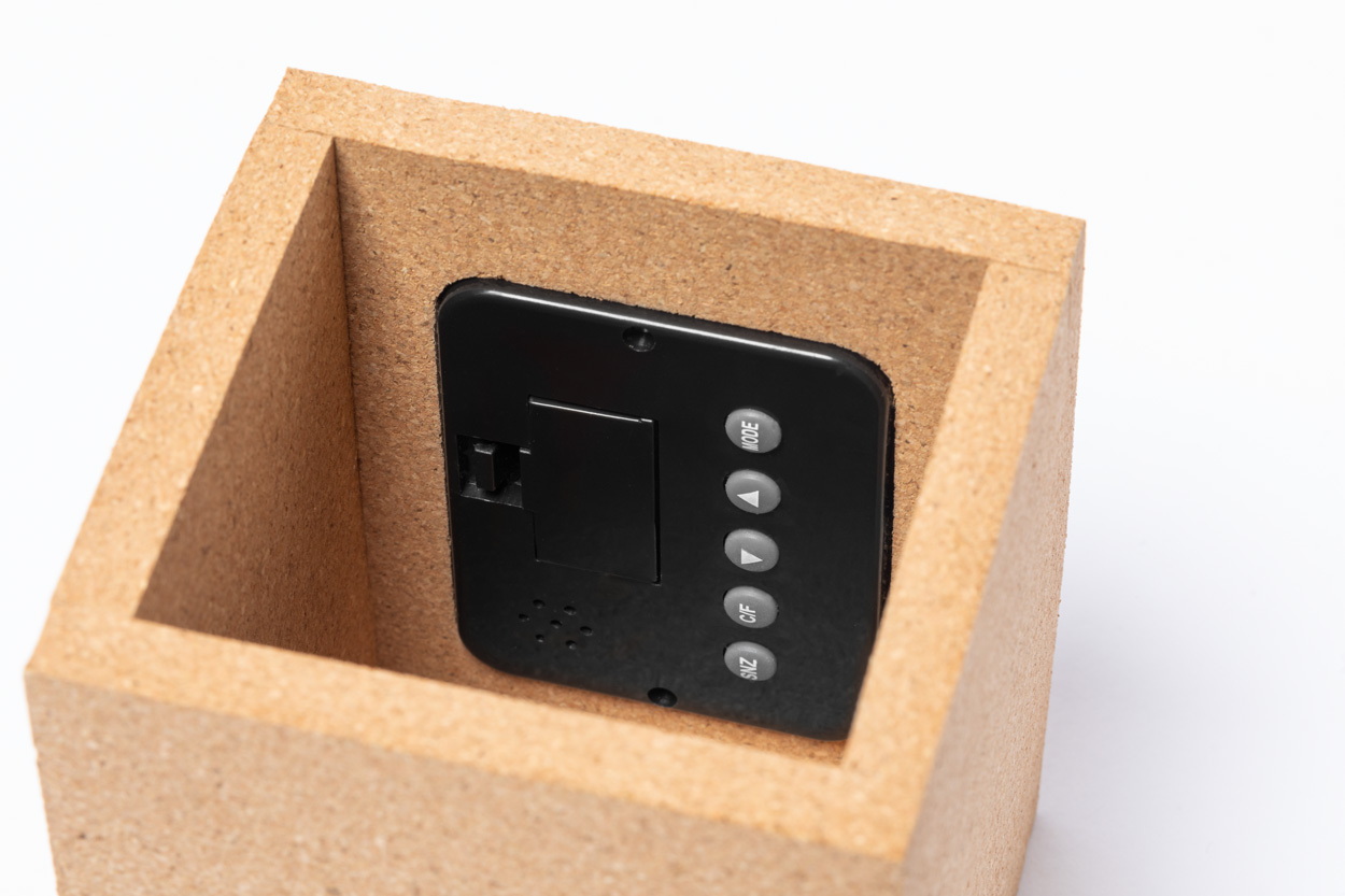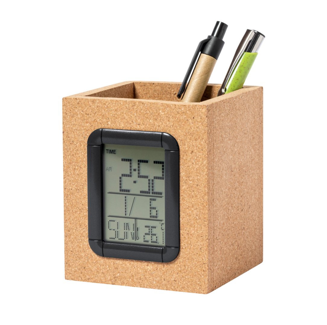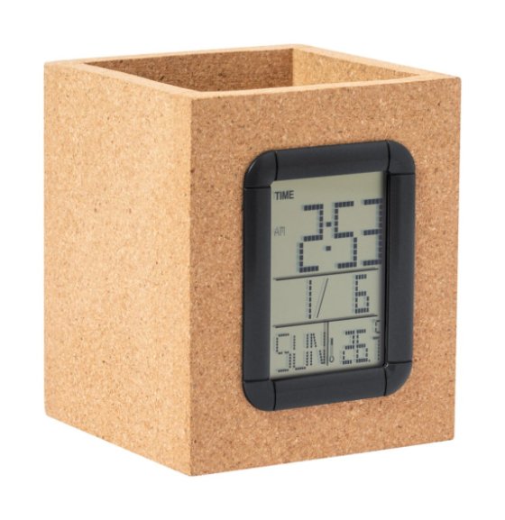 Természetes parafa tolltartó. Digitális kijelző, hőmérő, óra és naptár funkcióval. Gombelemmel szállítjuk.