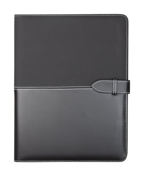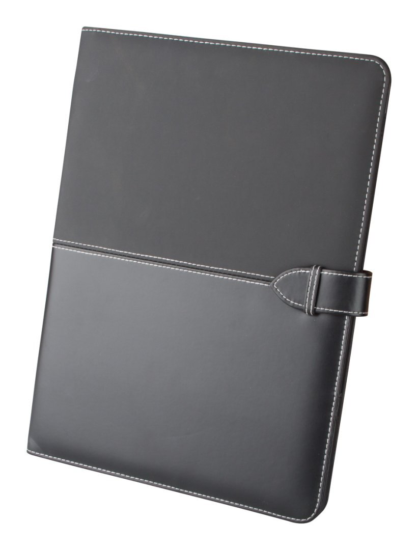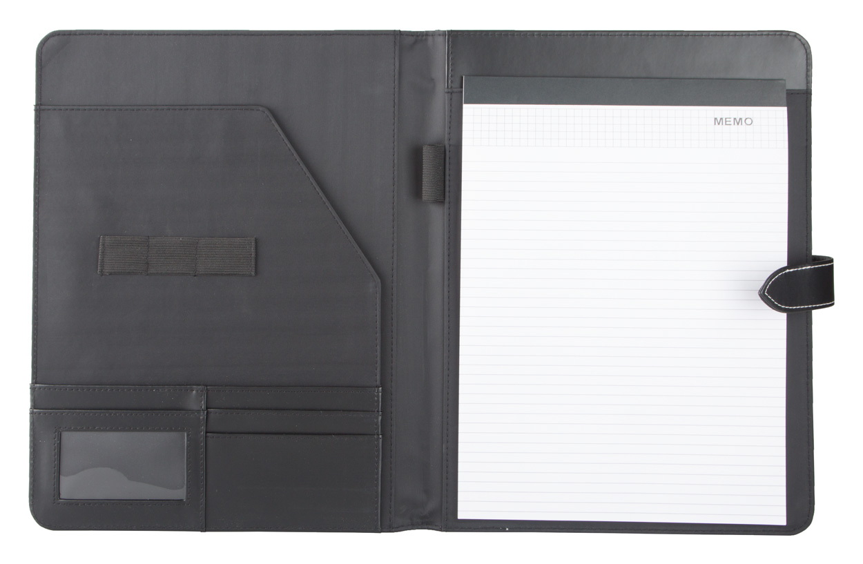 A4-es, műbőr iratmappa 20 lapos vonalas jegyzetfüzettel, jegyzettartó, névjegytartó és tolltartó résszel. A mappa műbőr pánttal zárható.