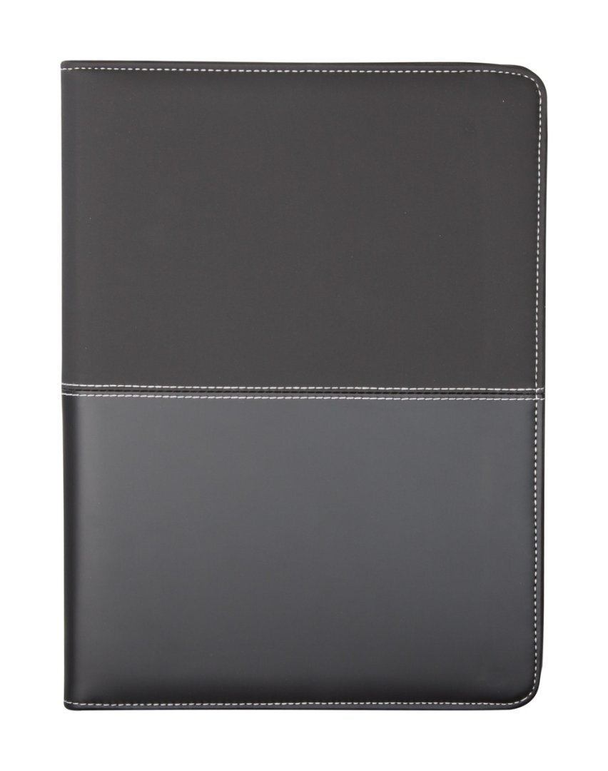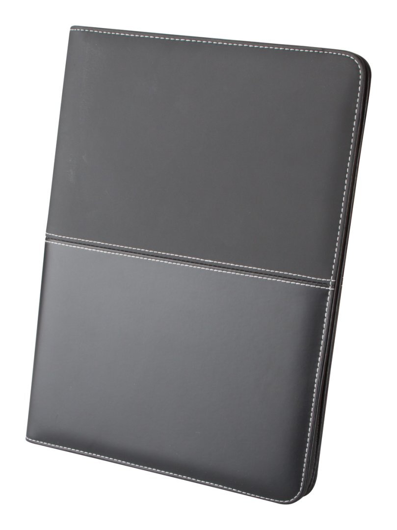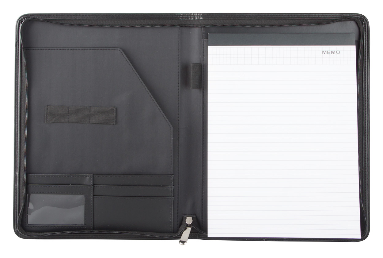 A4-es, cipzáras műbőr iratmappa 20 lapos vonalas jegyzetfüzettel, jegyzettartó, névjegytartó és tolltartó résszel.