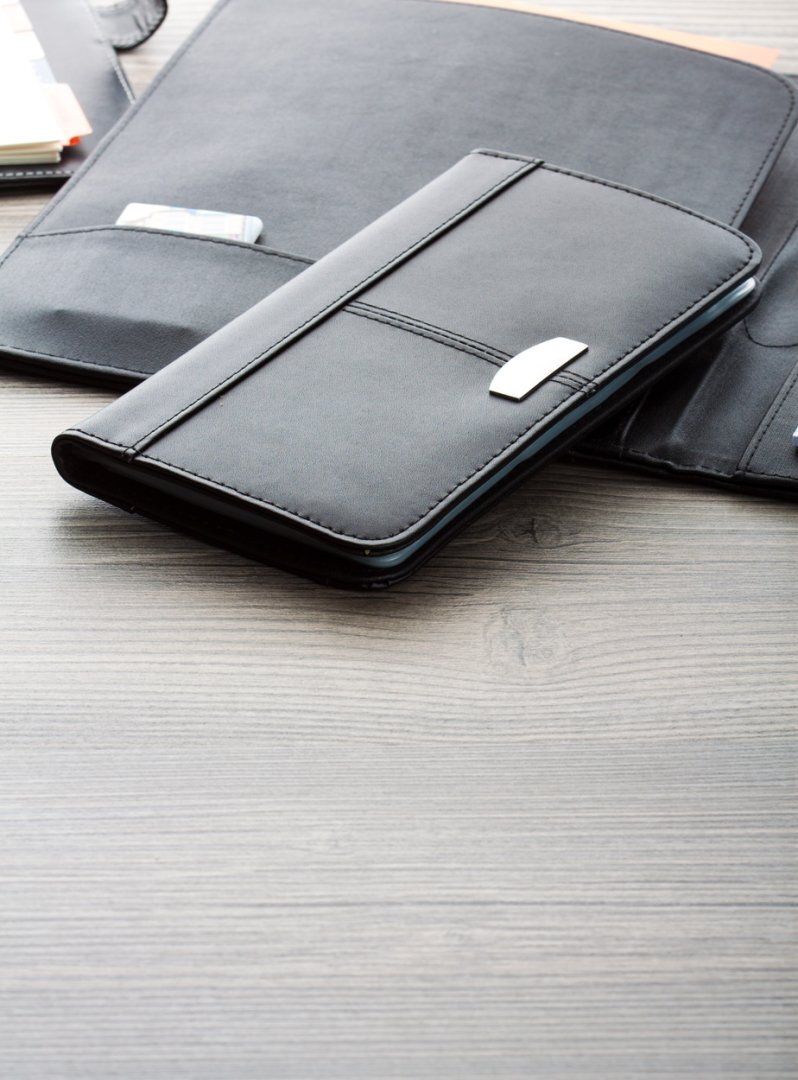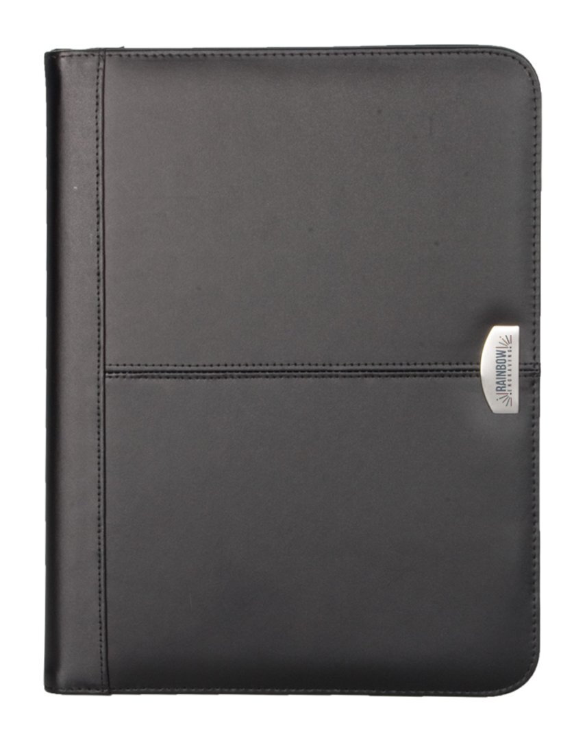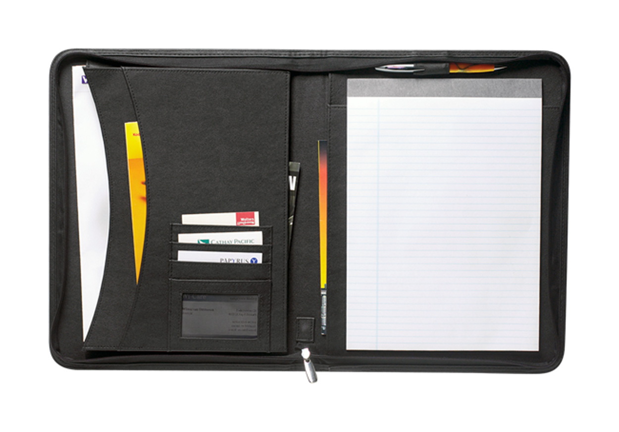 Fekete, varrott bőr összecipzározható iratmappa, vonalas lapokkal, cserélhető jegyzettömbbel, névjegy-, és tolltartó résszel, borítón díszítéssel.