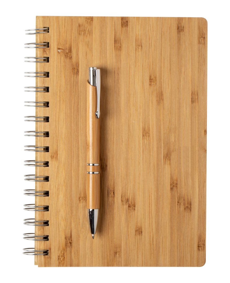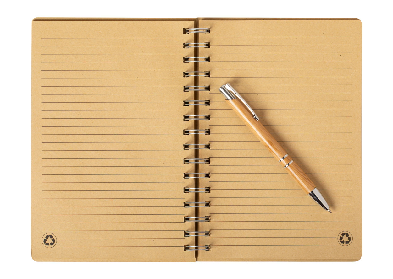 Bambusz borítású spirál jegyzetfüzet 80 vonalas A5 méretű lappal. Tartalmaz egy bambusz golyóstollat fekete tollbetéttel. Nátron papír dobozban.