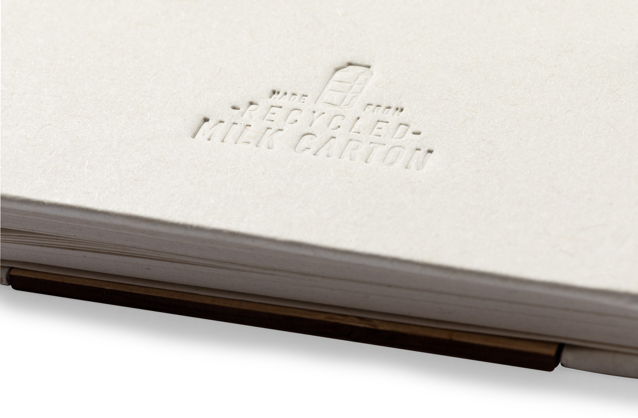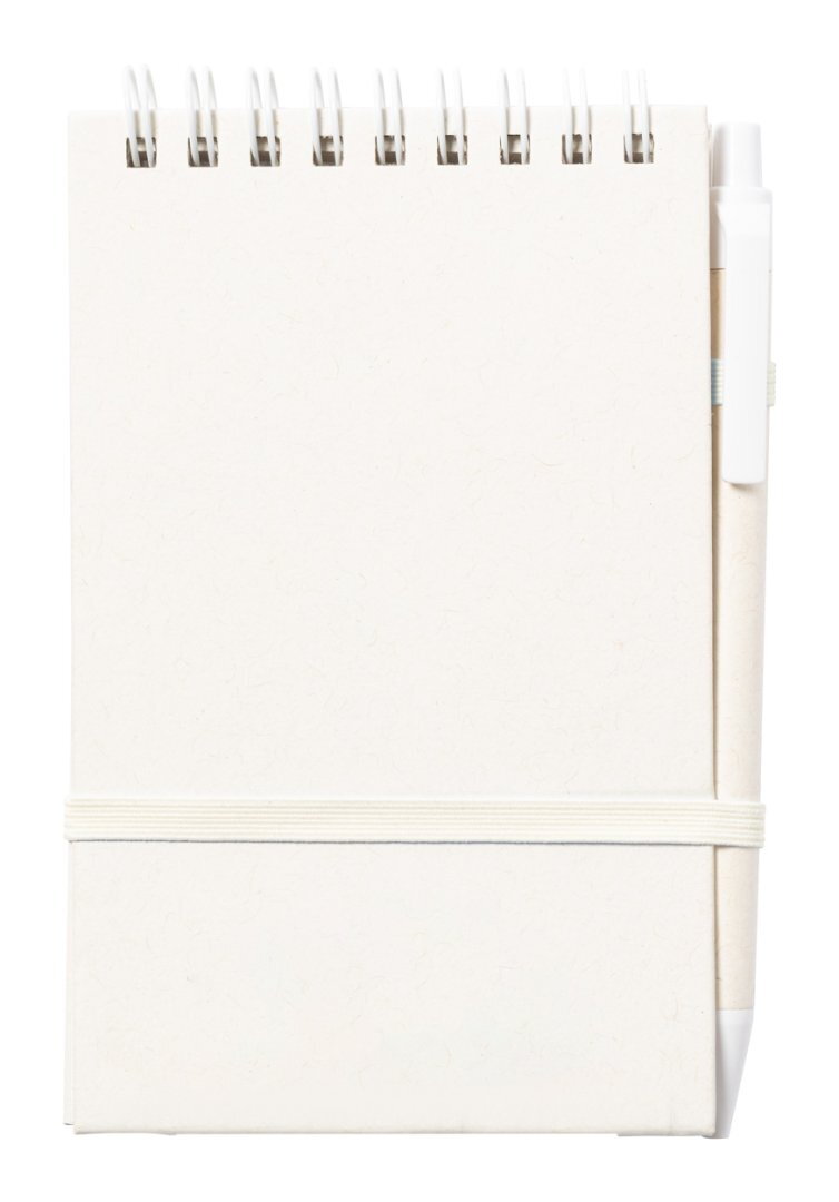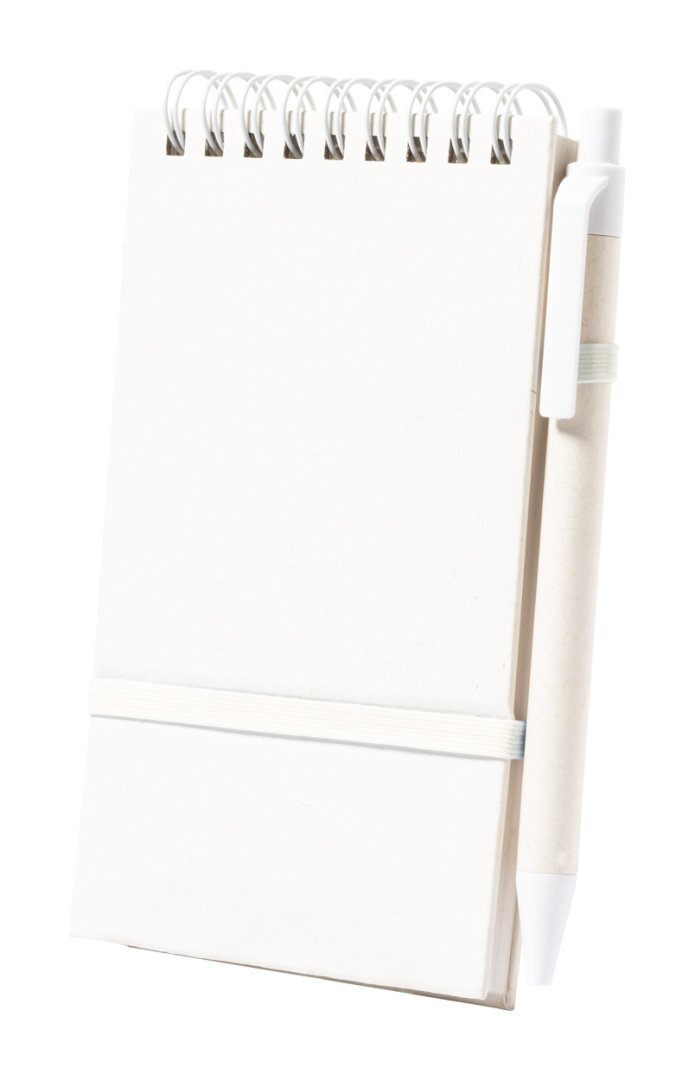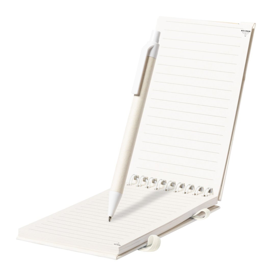 Újrahasznosított tejesdoboz borítású spirálfüzet gumipánttal és 80 vonalas lappal. Újrahasznosított tejesdoboz golyóstollal, kék tollbetéttel.