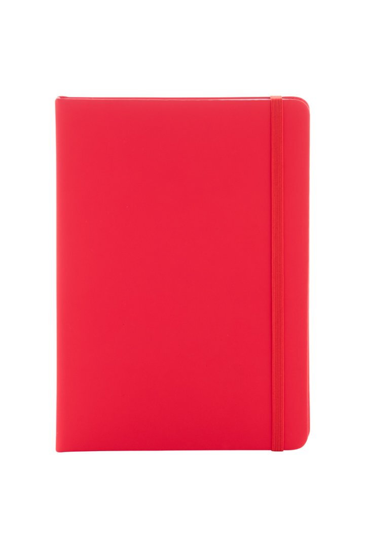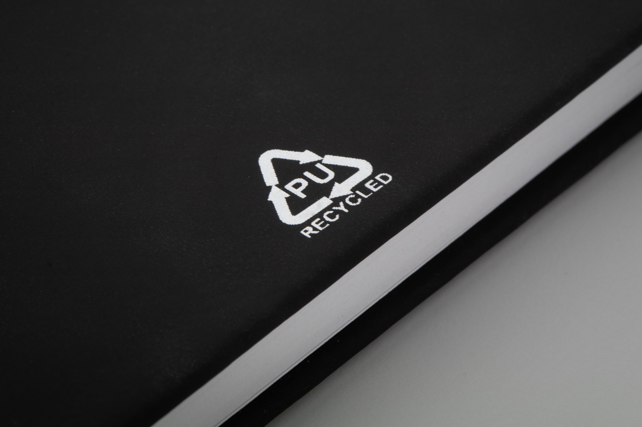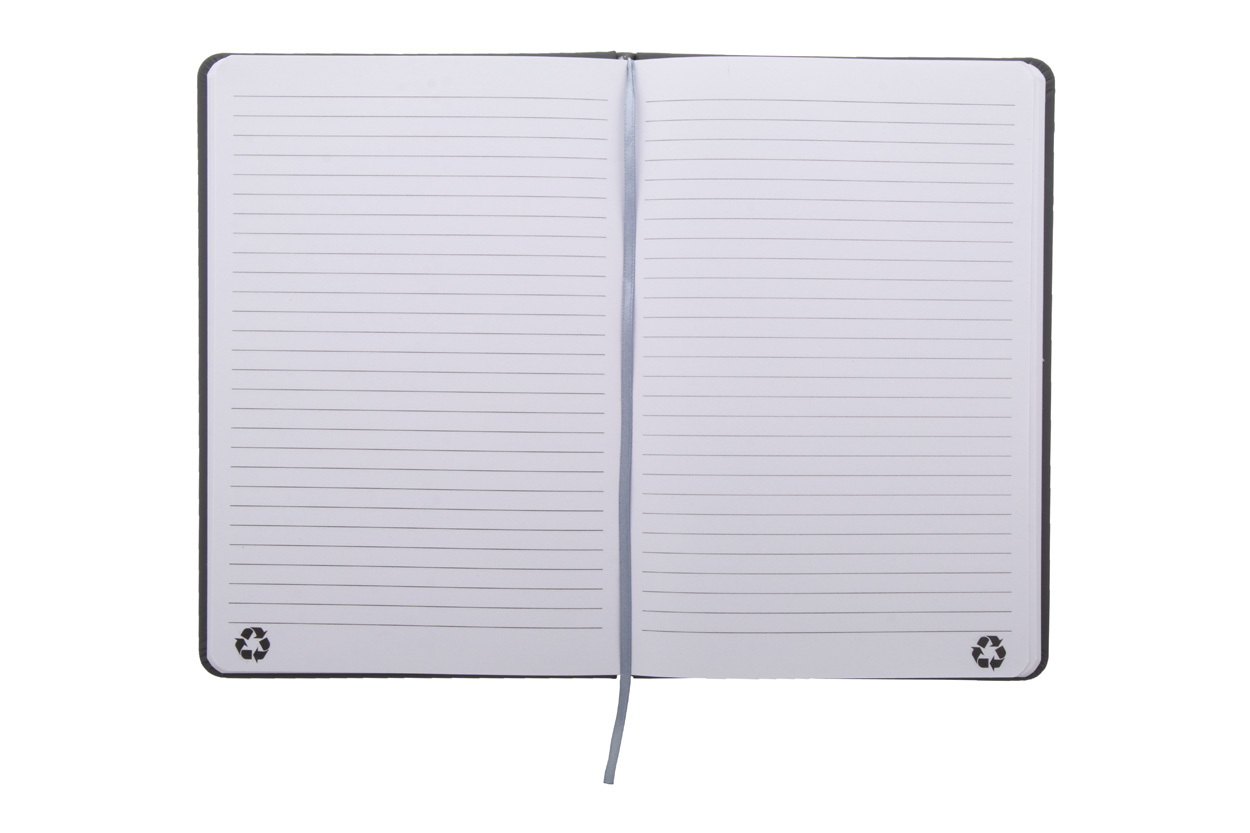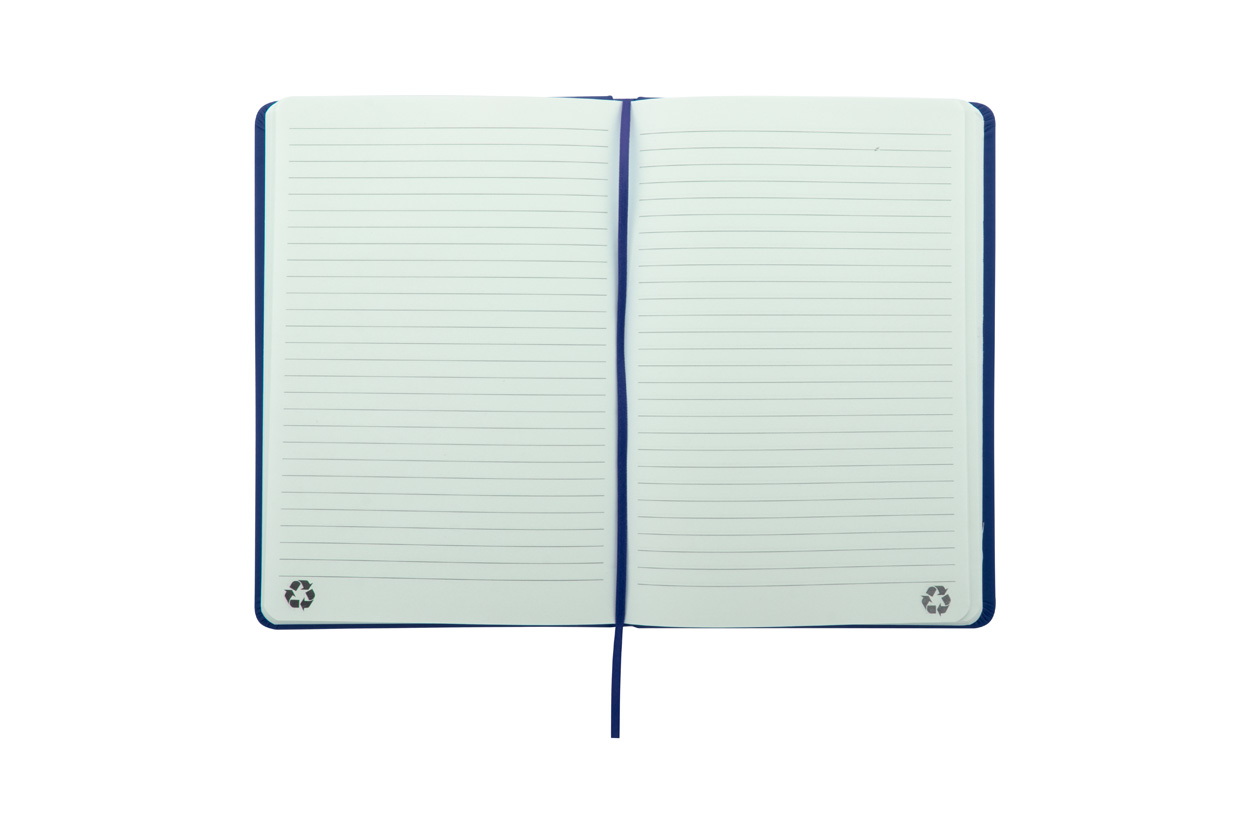 Újrahasznosított műbőr borítású jegyzetfüzet 100 vonalas lappal, újrahasznosított papírból. Megegyező színű könyvjelzővel és gumiszalaggal. A5 méretű.