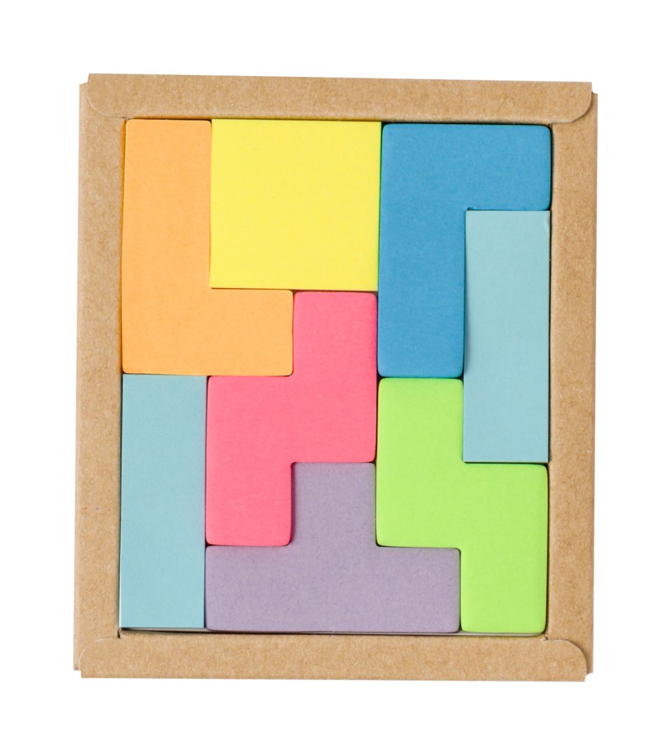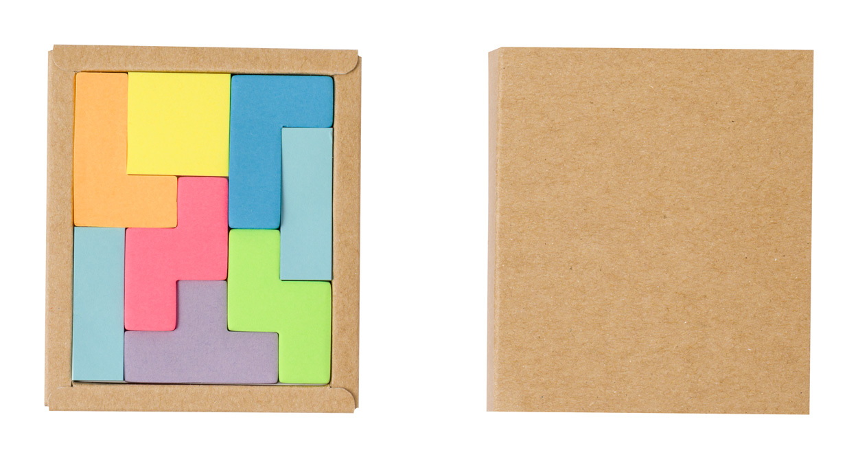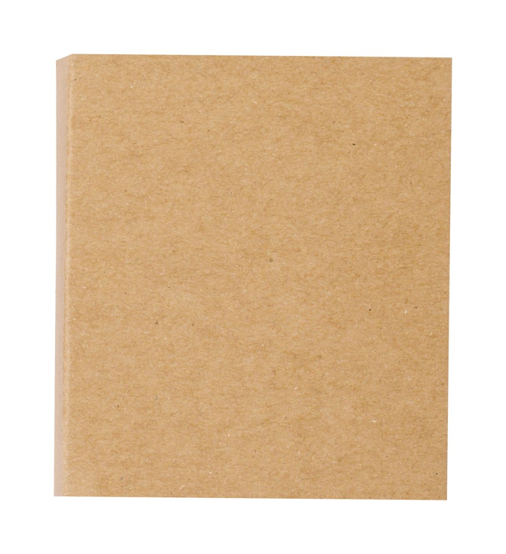 Újrahasznosított karton jegyzettömb 25 öntapadós lappal, 8 különböző színben és formában.