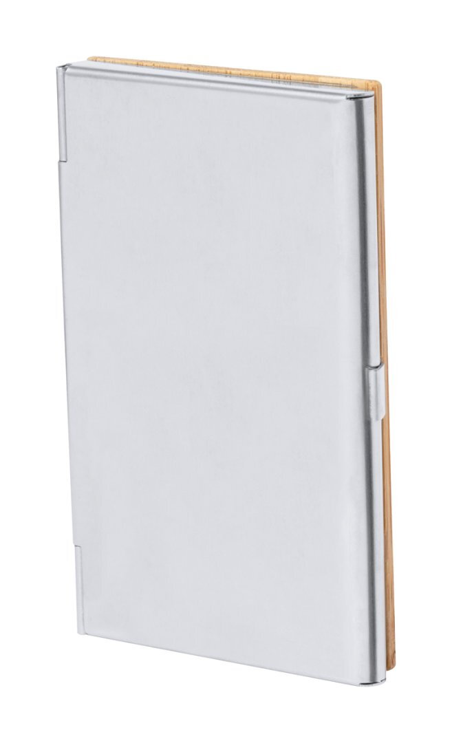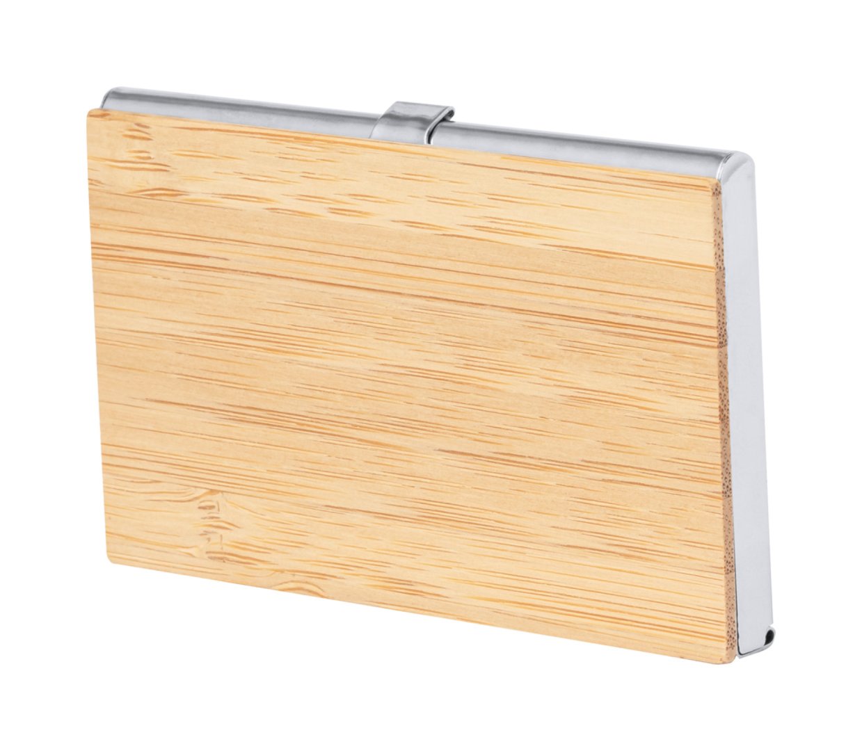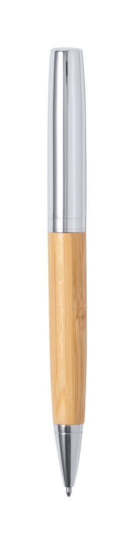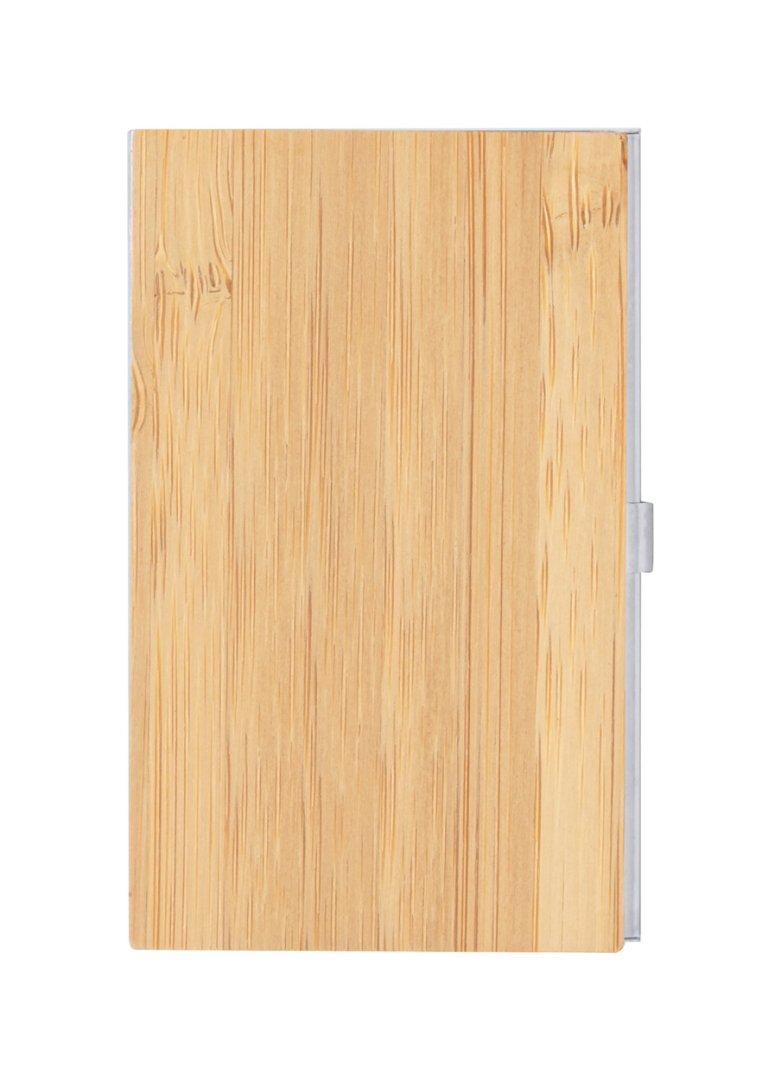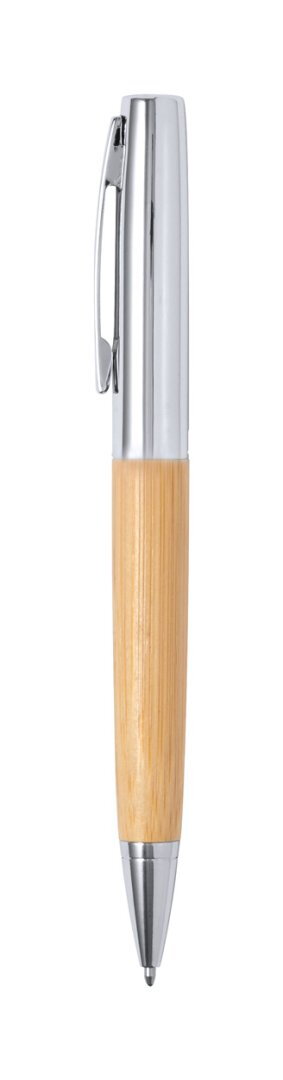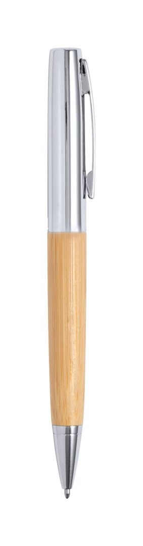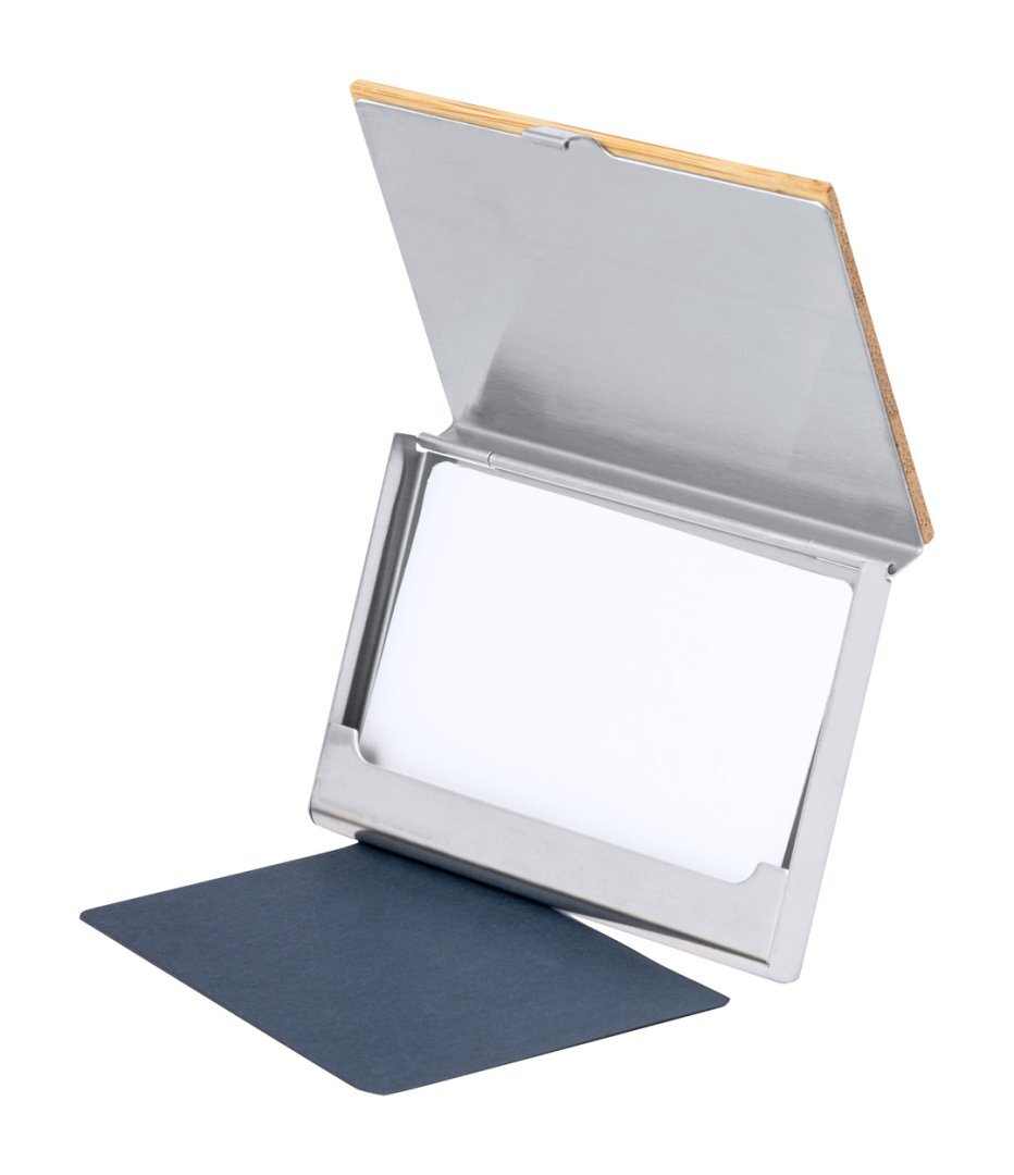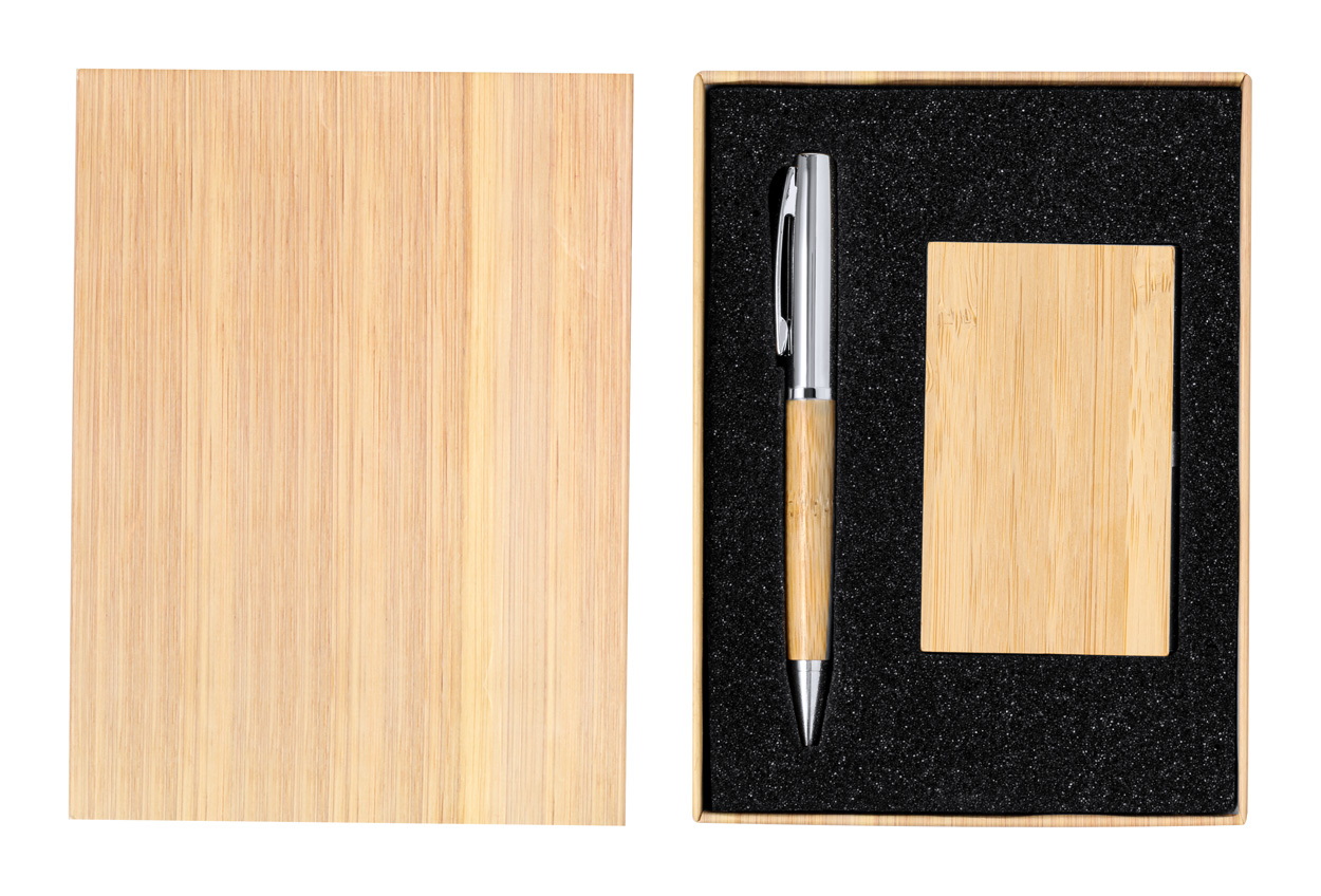 Névjegykártyatartó és tekerős golyóstoll fémből és bambuszból. Kék tollbetéttel, bambusz díszdobozban szállítjuk.