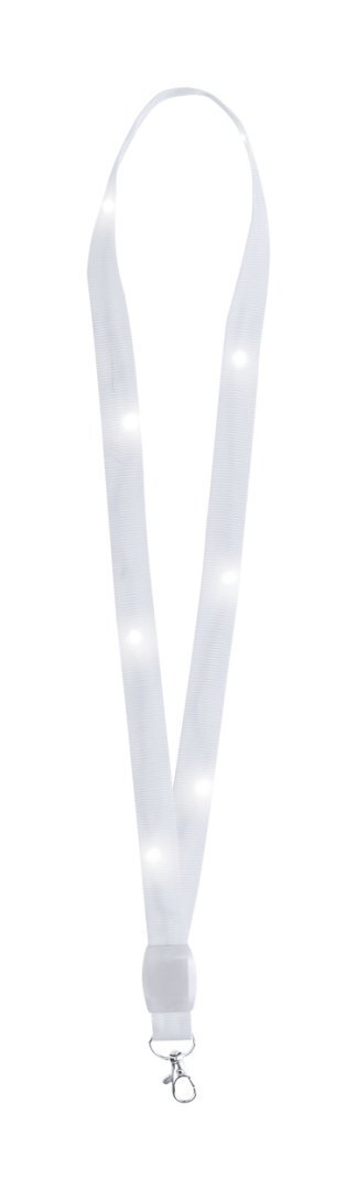 Poliészter nyakpánt fém kampóval, 8 LED-del és 3 fény móddal. Gombelemmel szállítjuk.